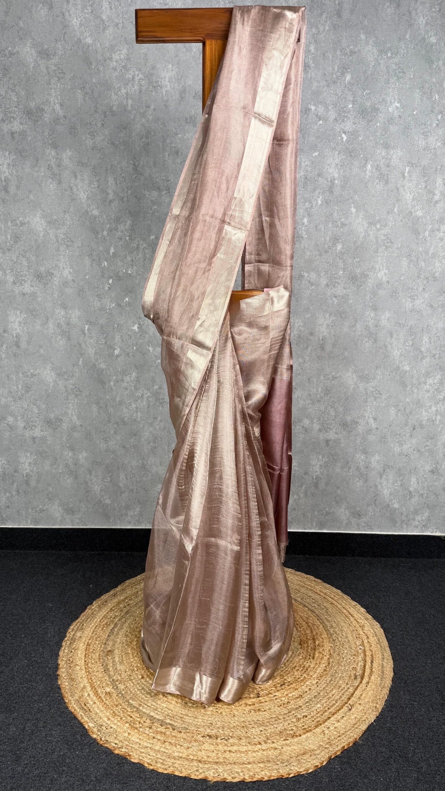This elegant tussar tissue saree features a soft mauve champagne body with a subtle sheen and silver zari borders. The contrasting deep blue pallu adds a vibrant touch. Lightweight and graceful, it’s ideal for festive and formal occasions.The saree comes with attached self color blouse piece.