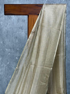 This elegant tussar tissue saree comes in a soft gold shade with a subtle metallic sheen. The smooth, translucent texture adds a graceful fluidity to the drape, making it perfect for both formal and festive occasions.The saree comes with attached self color blouse piece.