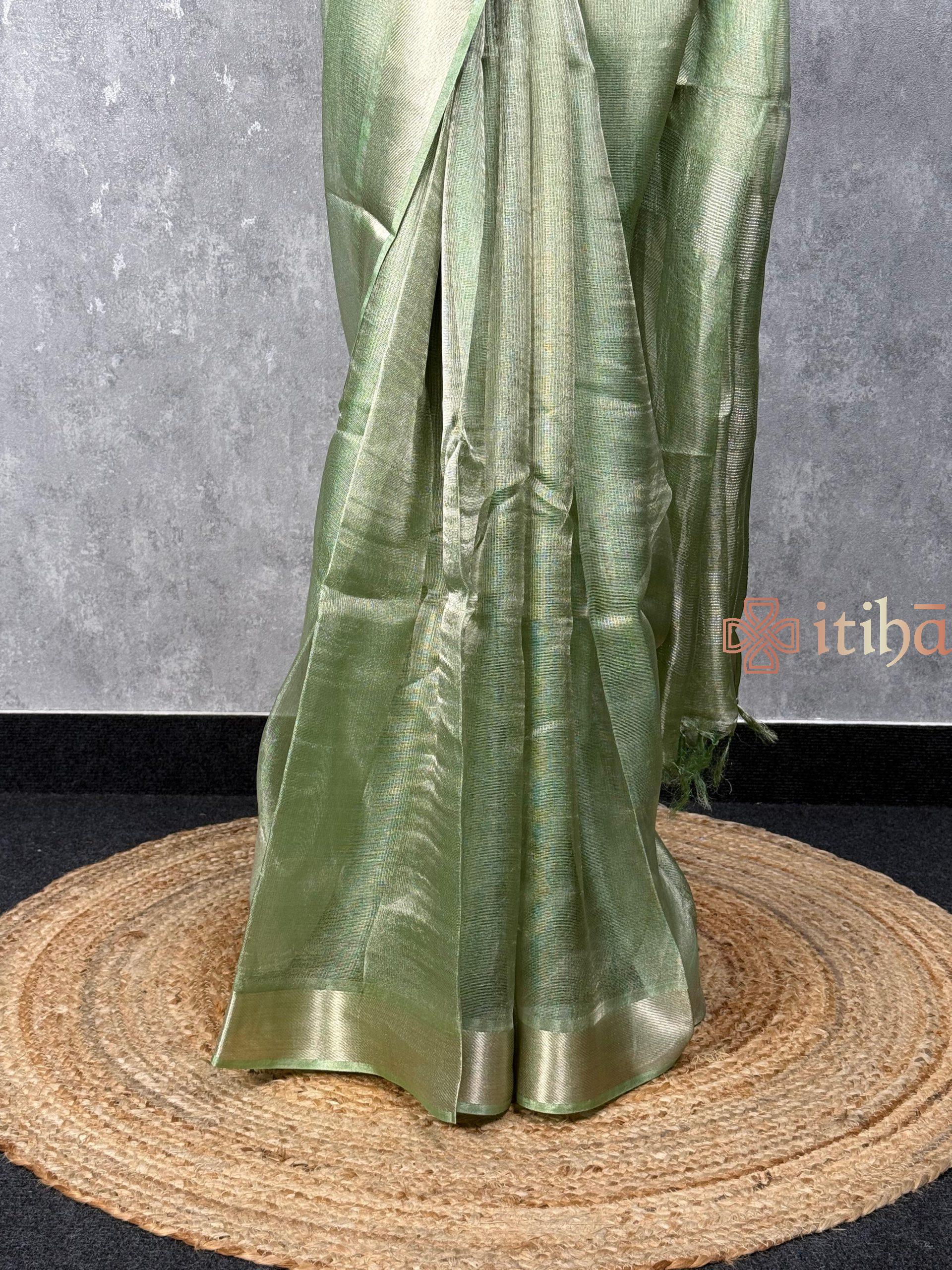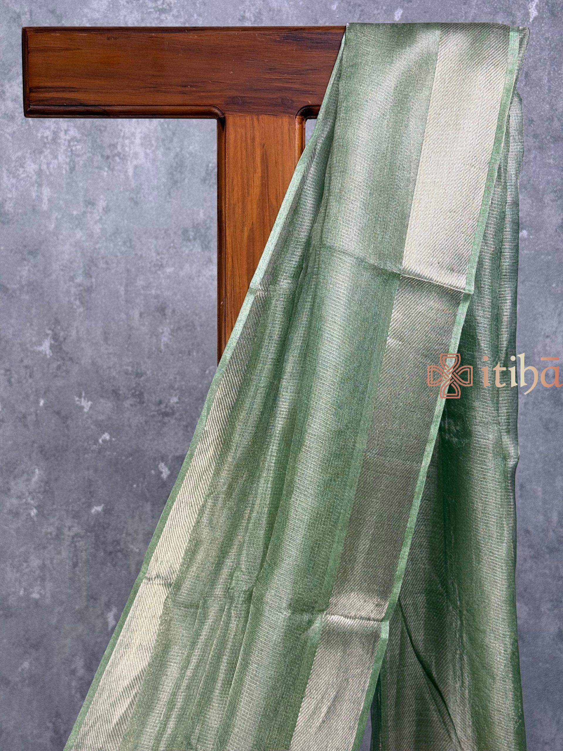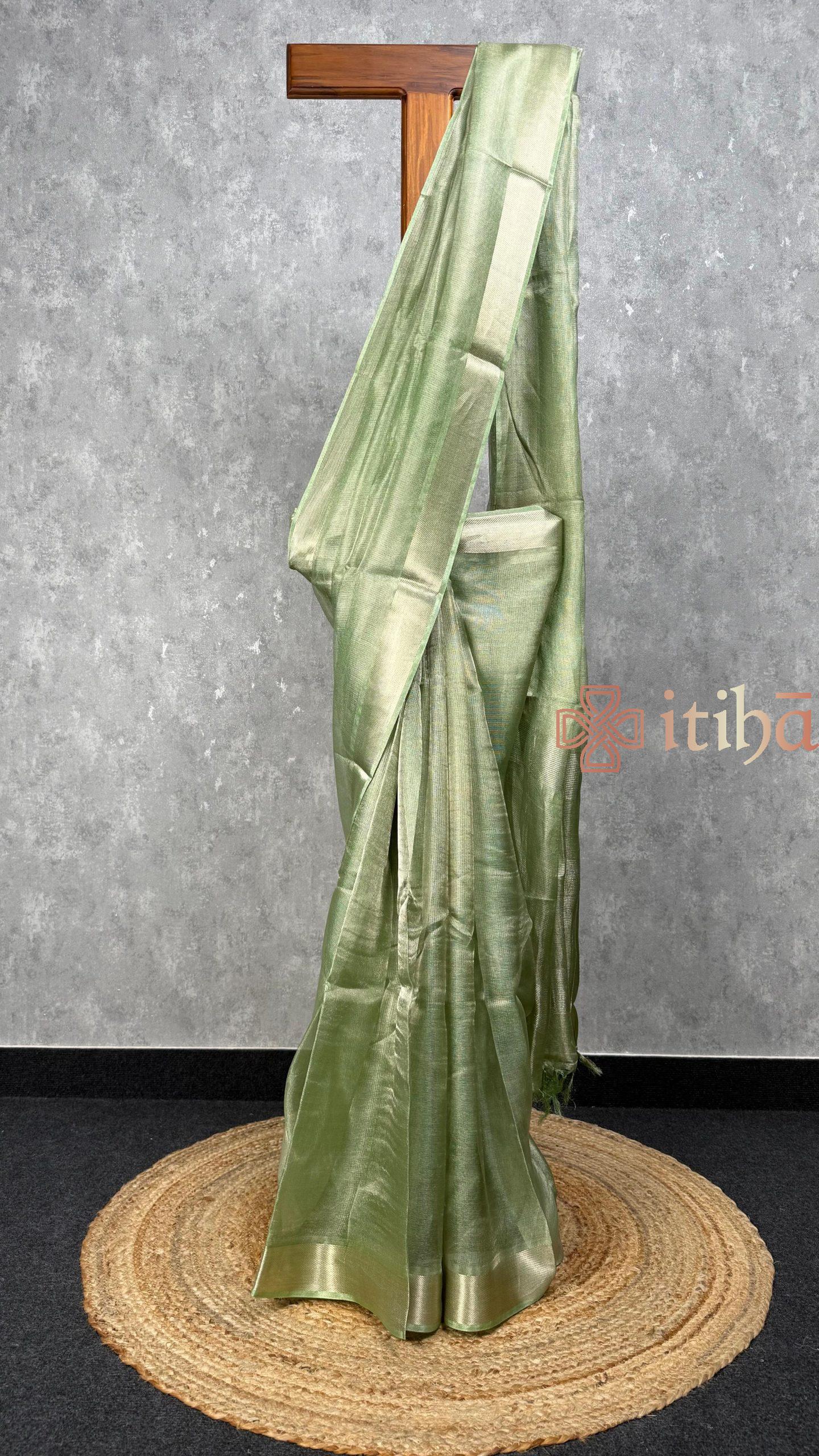 This elegant tussar tissue saree comes in a light green shade with a subtle metallic sheen. The smooth, translucent texture adds a graceful fluidity to the drape, making it perfect for both formal and festive occasions.The saree comes with attached self color blouse piece.