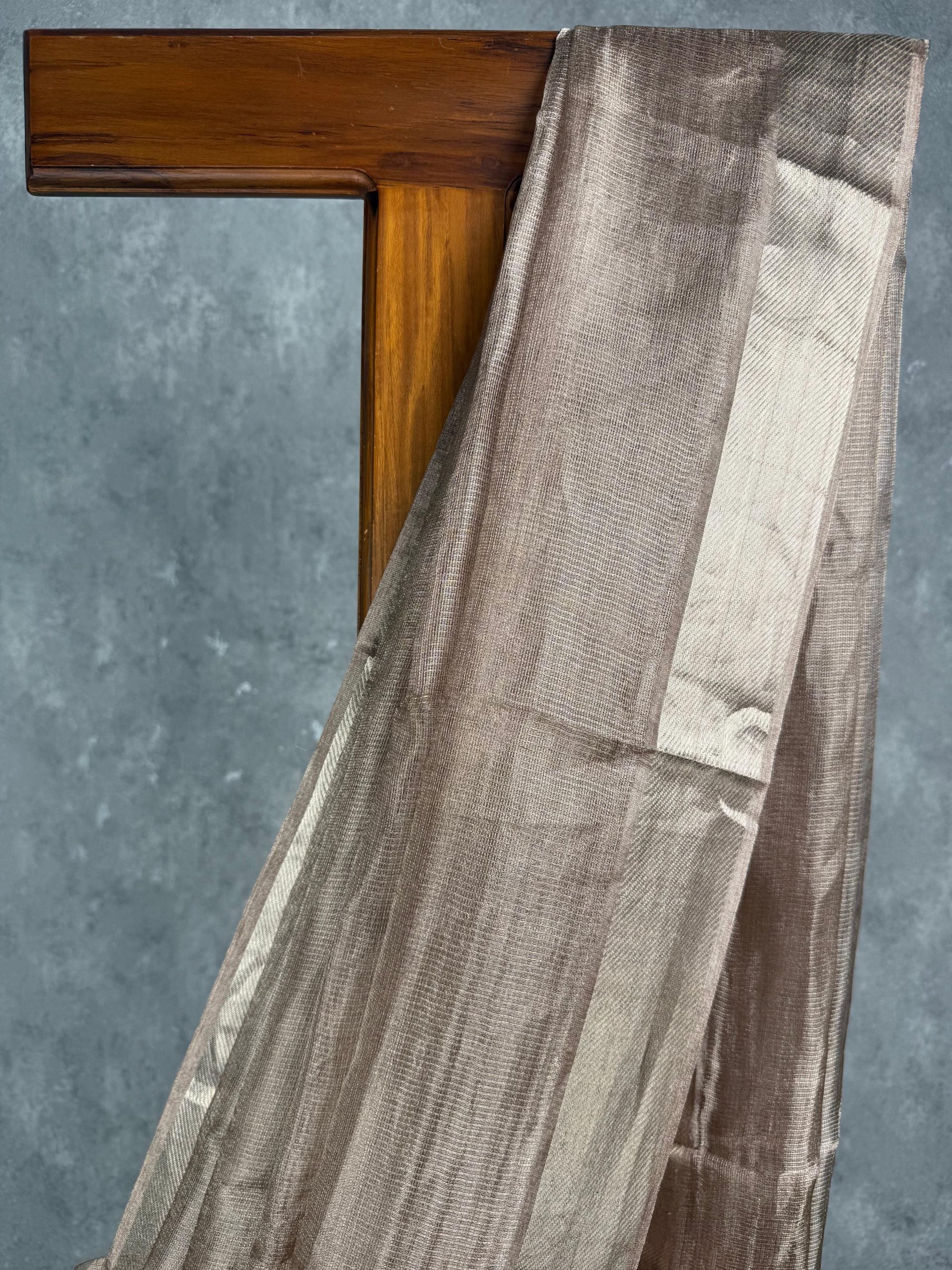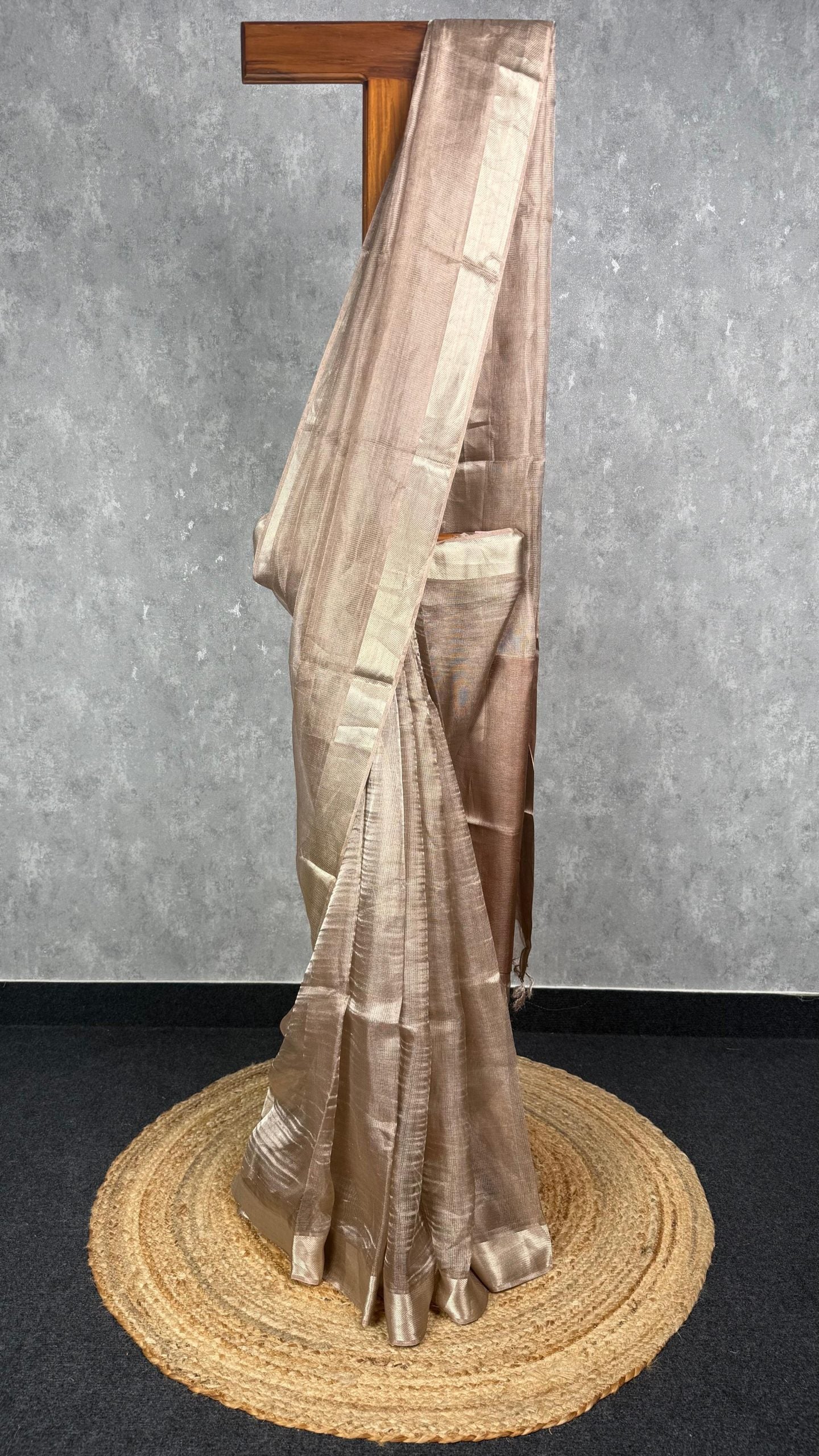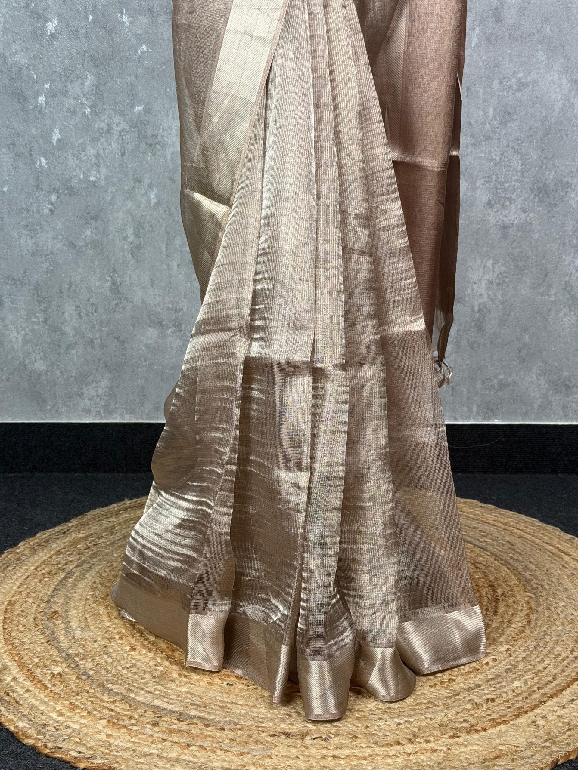 This elegant tussar tissue saree features a soft champagne beige body with a subtle sheen and silver zari borders. The contrasting deep blue pallu adds a vibrant touch. Lightweight and graceful, it’s ideal for festive and formal occasions.The saree comes with attached self color blouse piece.