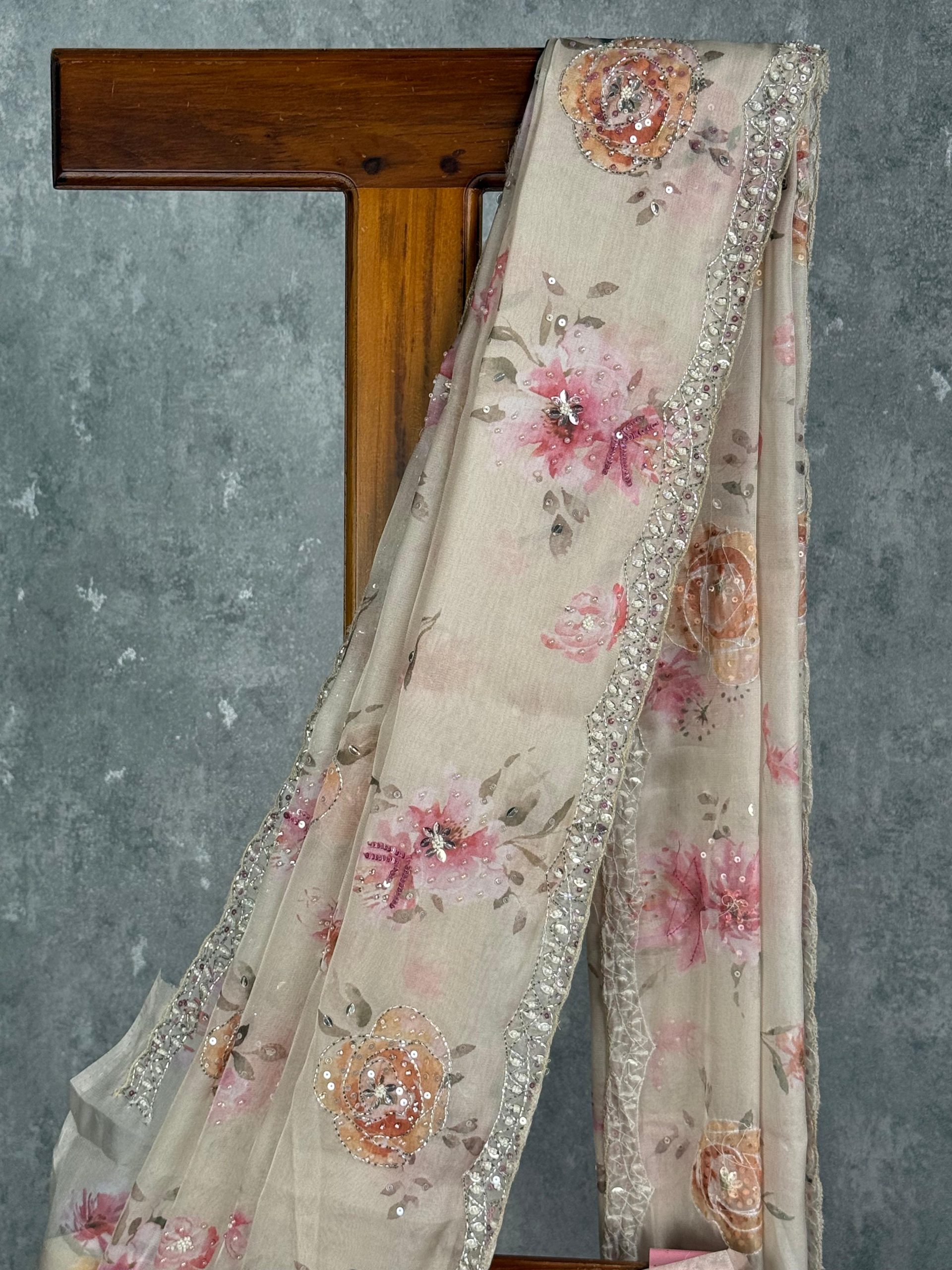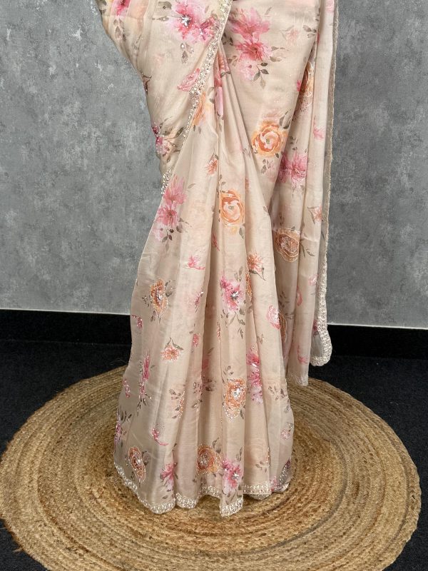 This saree features a soft beige base adorned with delicate floral prints in shades of pink, peach, and orange, creating a graceful and feminine look. The subtle shimmer along the border adds a touch of sophistication, making it perfect for elegant daytime or festive occasions