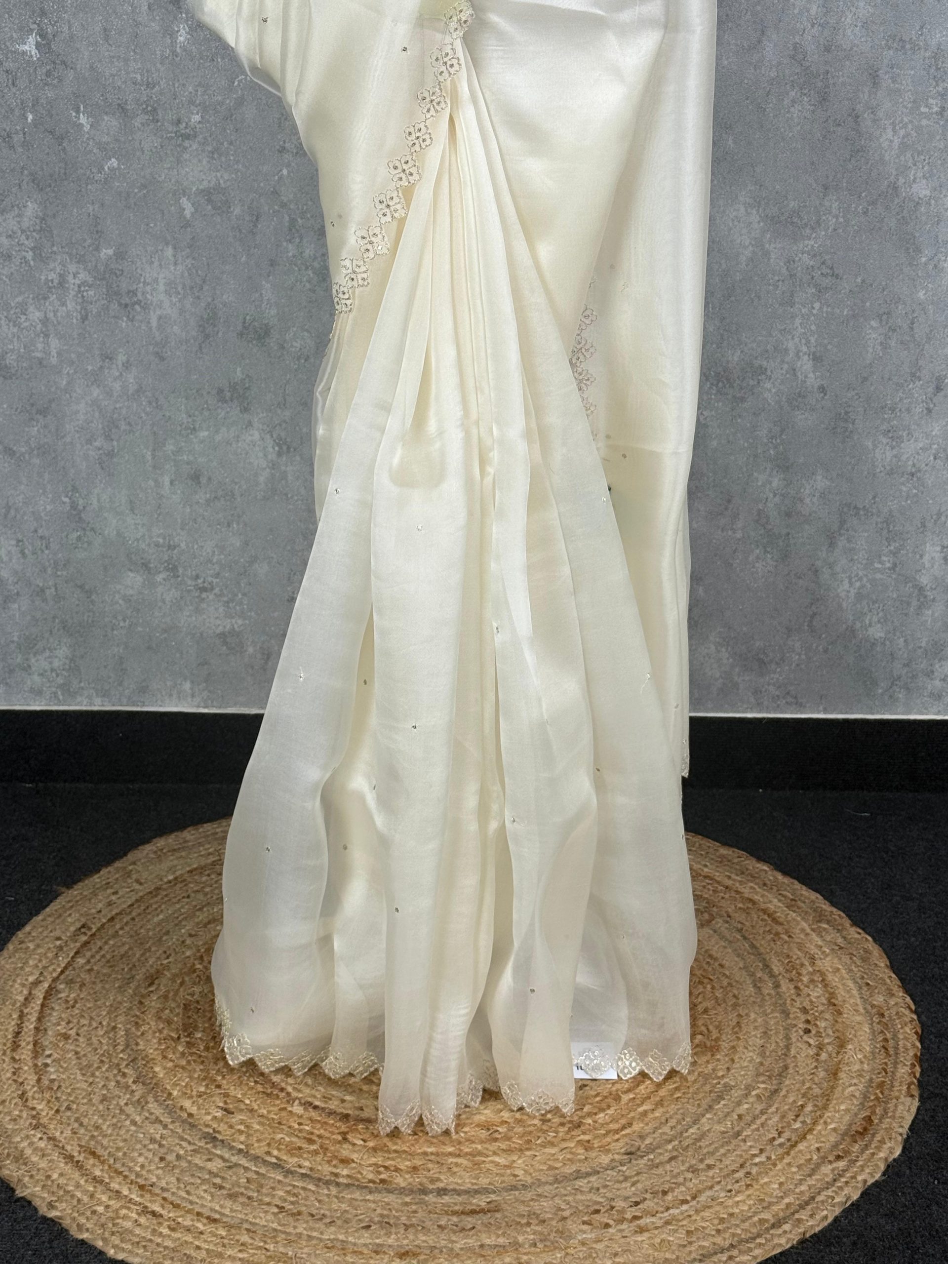 This elegant saree exudes minimalistic charm with its soft ivory tone and delicate lace-edged border. The subtle shimmer of the fabric and minimal embellishments lend it a refined, graceful look. Perfect for formal occasions or serene celebrations, it embodies effortless sophistication