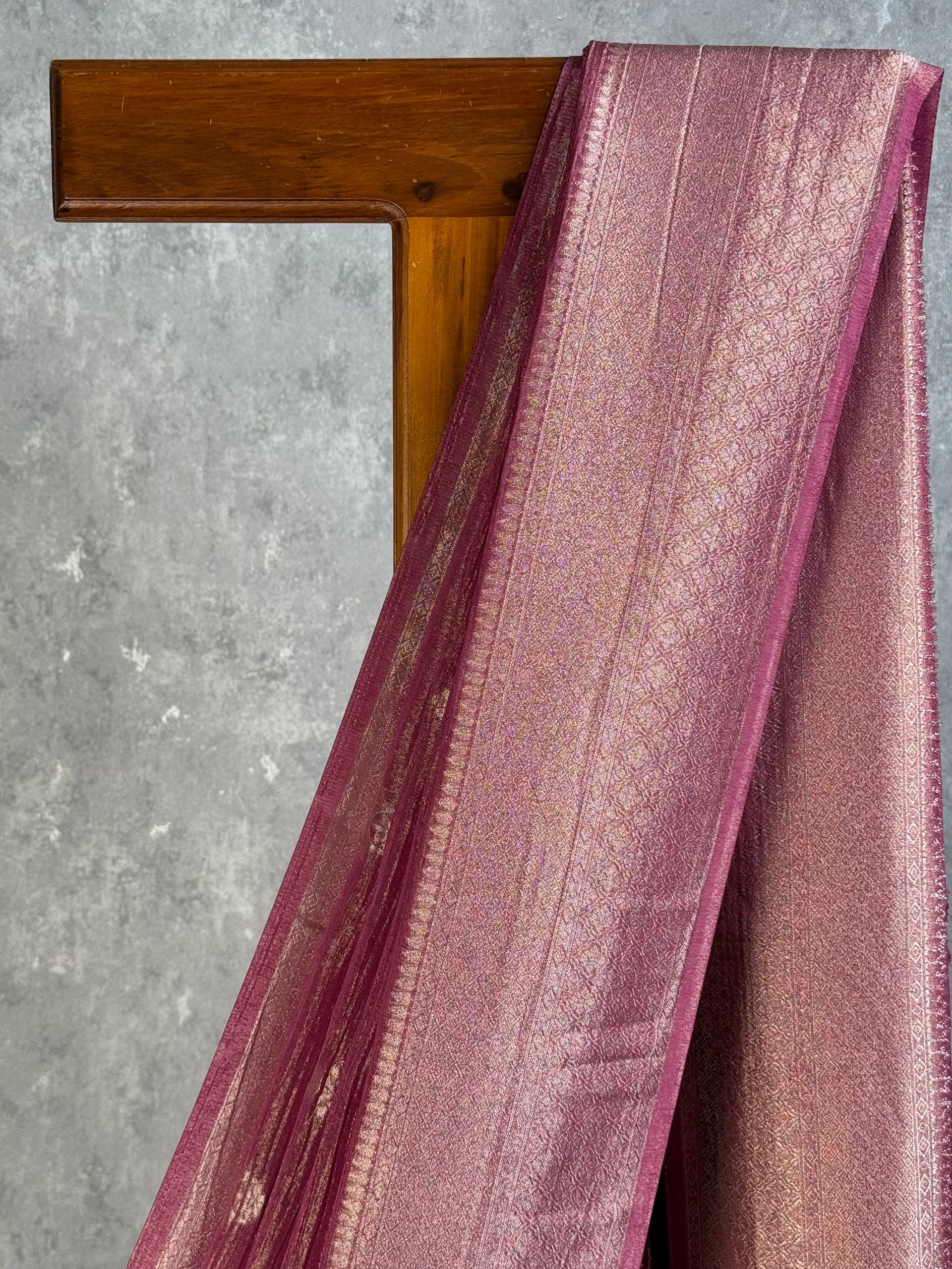 This crushed tissue silk Banarasi saree is in a vibrant rani pink colour with a shimmery texture. The saree features intricate patterns woven with golden accents, adding a touch of elegance. The fabric has a crushed tissue effect giving it a unique texture. The saree showcases traditional Banarasi craftsmanship with its rich patterns and colour. The saree comes with attached self color blouse piece.