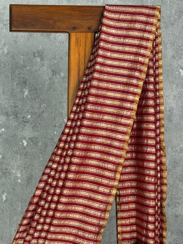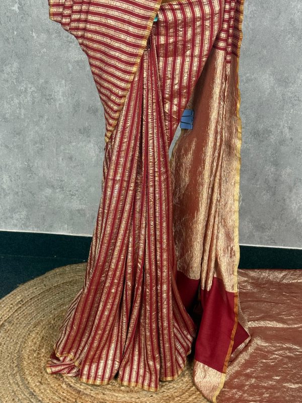 This saree features a striking combination of rich maroon and gold stripes, giving it a bold and opulent appearance. The shimmering texture enhances its festive charm, while the contrasting pallu adds a luxurious finishing touch. Perfect for weddings, celebrations, and grand occasions, it effortlessly blends tradition with contemporary elegance.