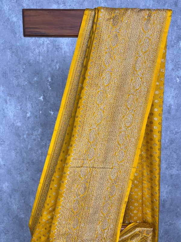 This stunning Semi Georgette Antique Zari Banarasi Saree comes in a vibrant yellow shade, admired with intricate antique gold zari weavings. The saree comes with attached self color blouse piece.