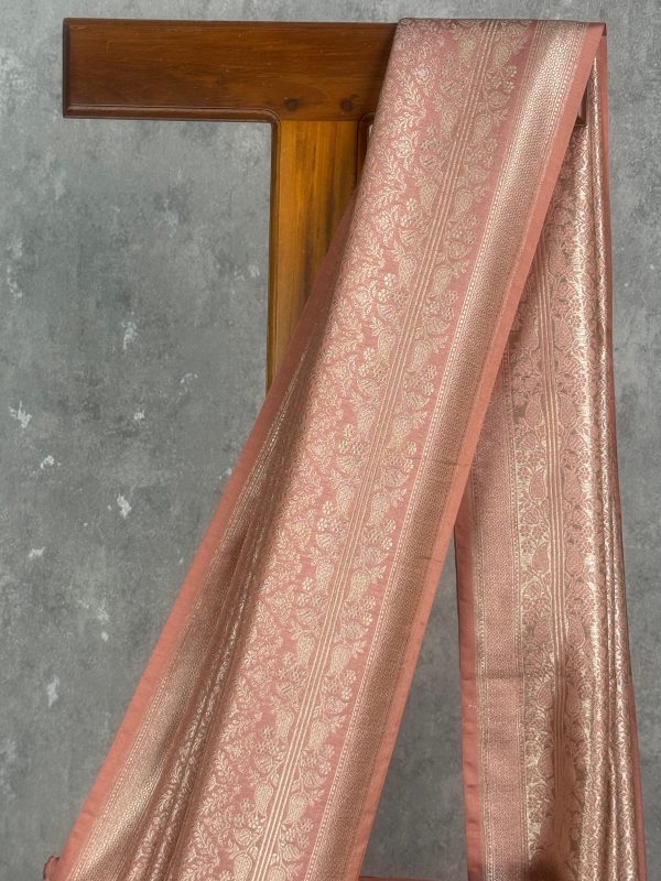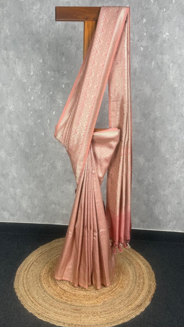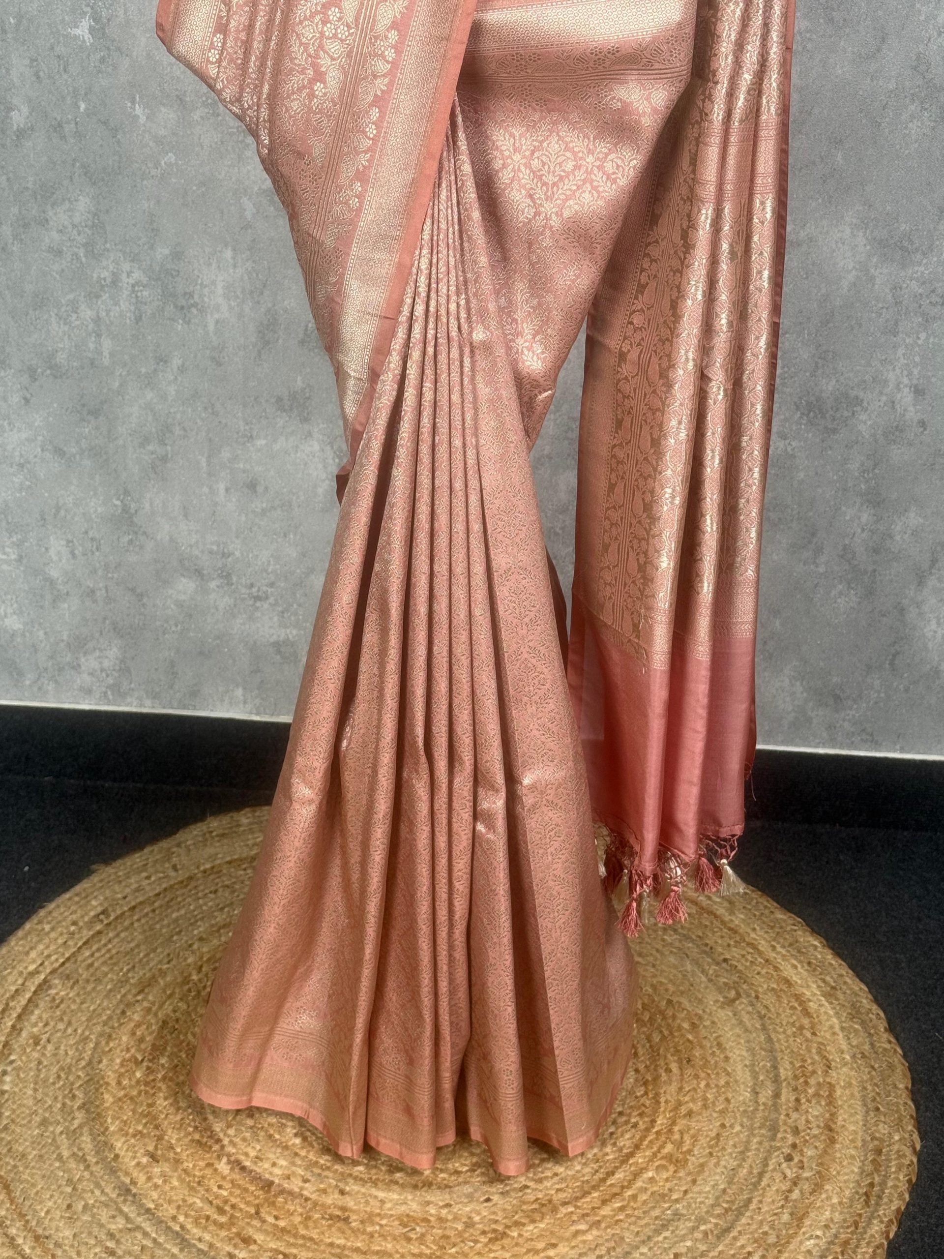 This saree showcases a graceful peach-rose hue with a soft, lustrous finish that enhances its intricate woven detailing. The delicate motifs and subtle sheen come together to create an elegant and timeless appeal. Perfect for festive and special occasions, it radiates understated sophistication and charm.
