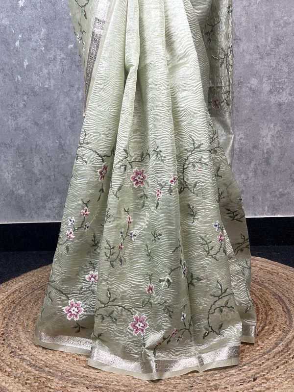 Semi organza saree featuring beautiful cross-stitch embroidery.The pista green shade is adorable with small floral patterns. The saree comes with attached blouse piece.