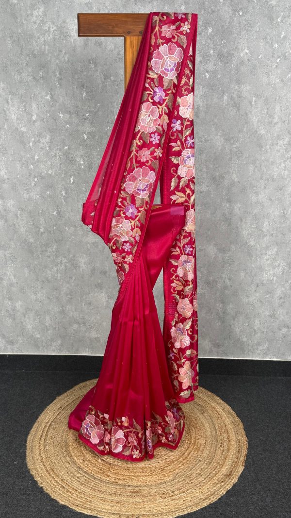 This saree features a bold and vibrant deep pink-red shade that instantly stands out with elegance. The richly woven multicolour floral patterns along the border and pallu add a luxurious and festive charm. Perfect for weddings and celebrations, it beautifully blends striking colour with intricate craftsmanship