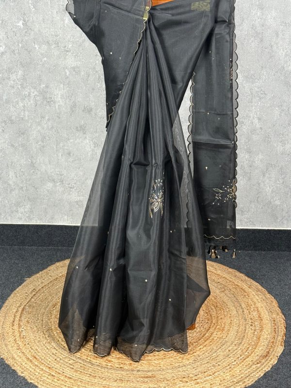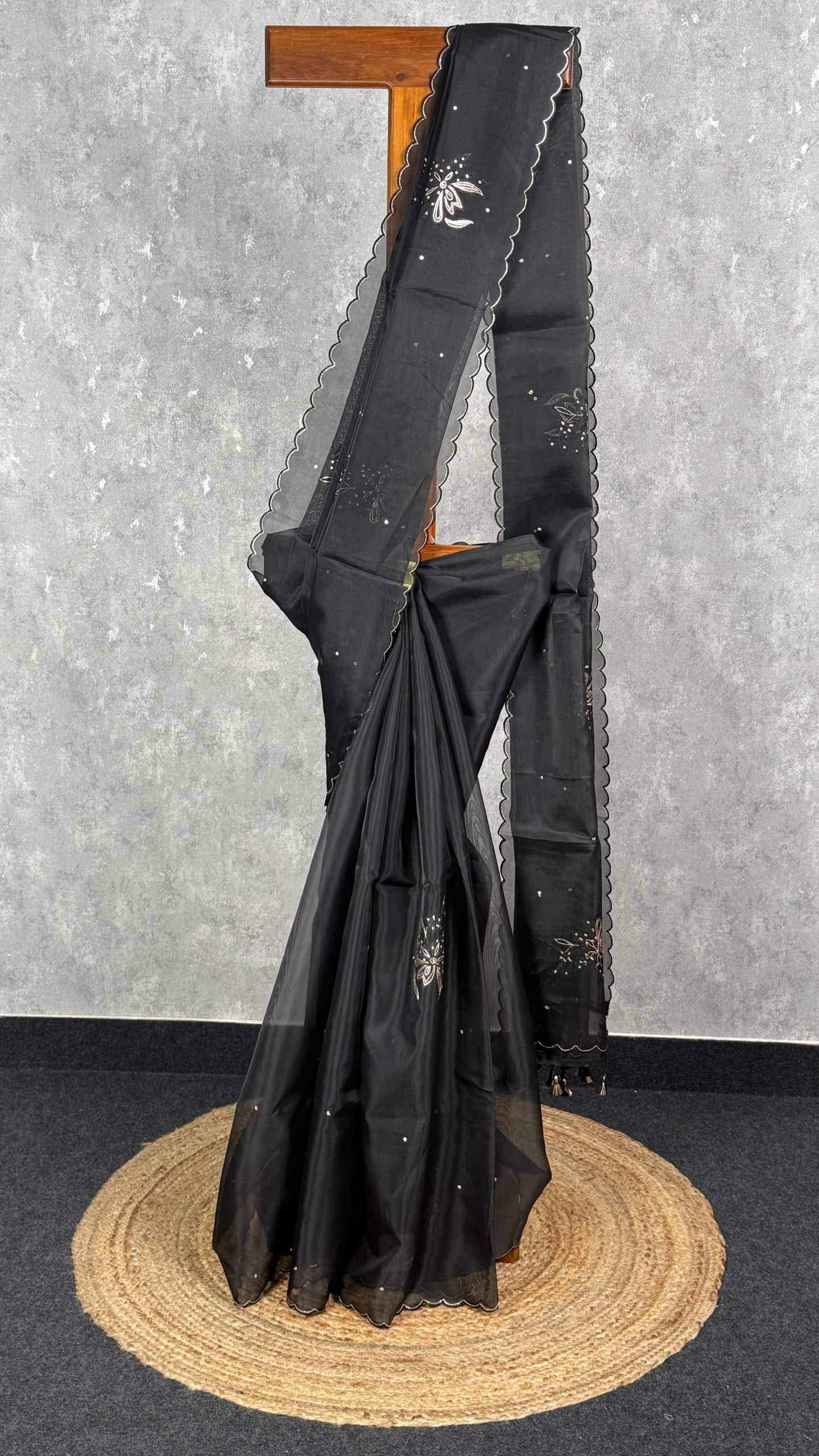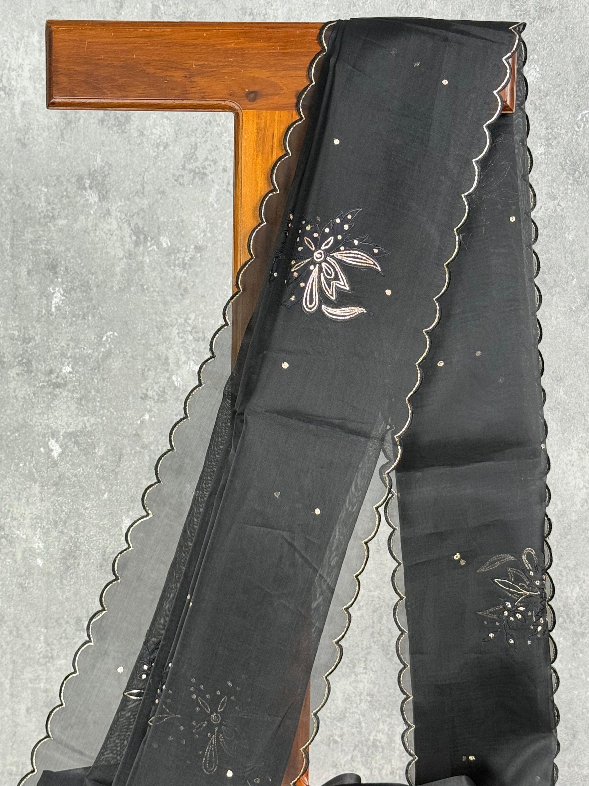 This elegant black saree exudes timeless sophistication with its subtle embroidery and delicate scalloped border. The minimal yet graceful design adds a refined charm, perfect for evening occasions or formal gatherings. Its rich hue and understated embellishments create a look of effortless elegance.