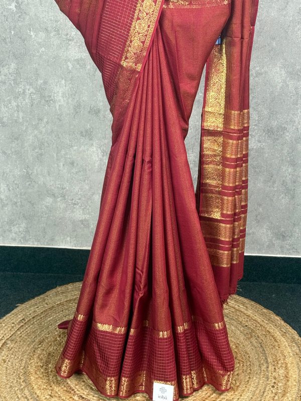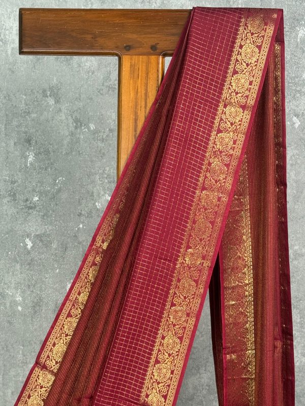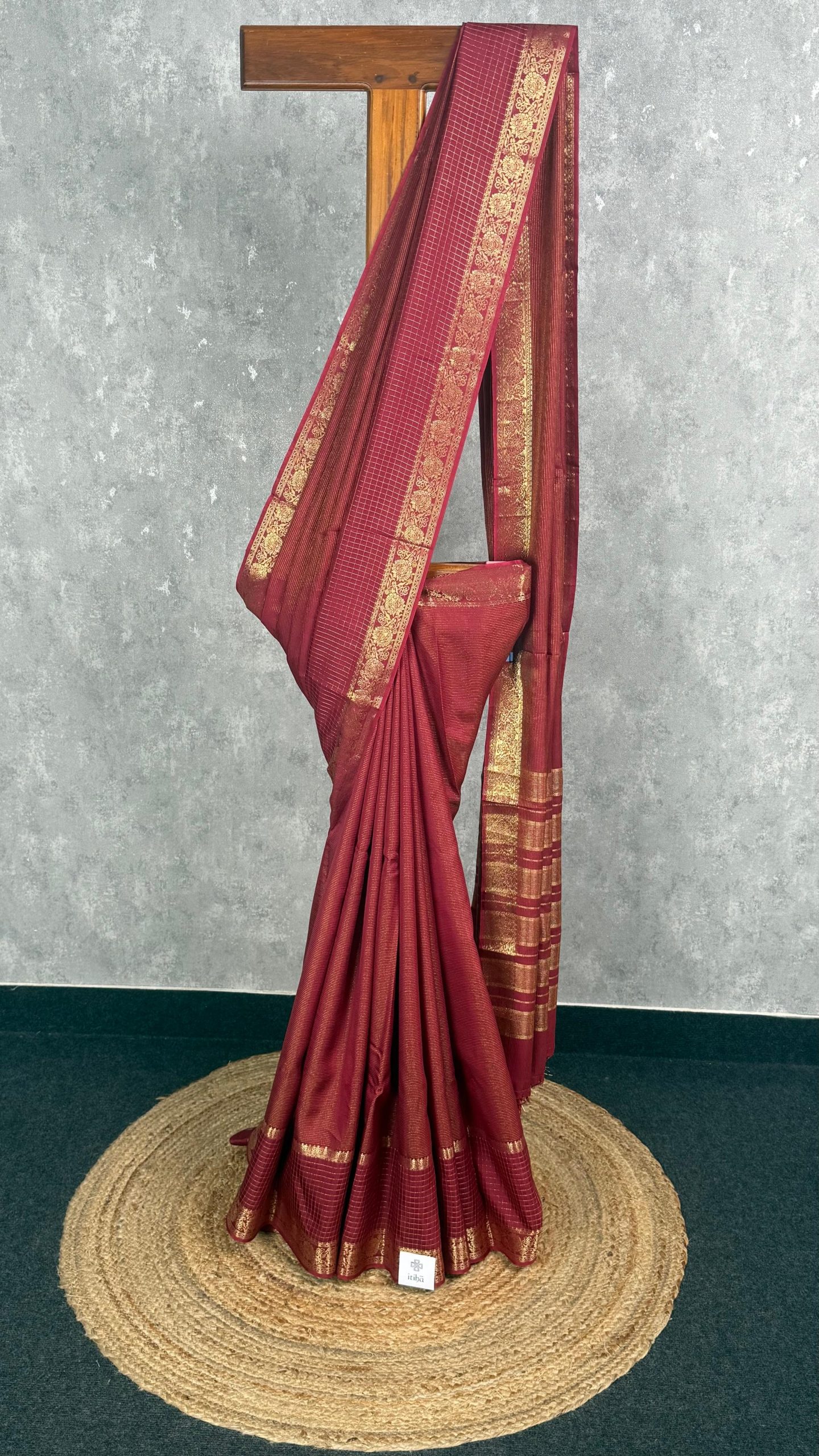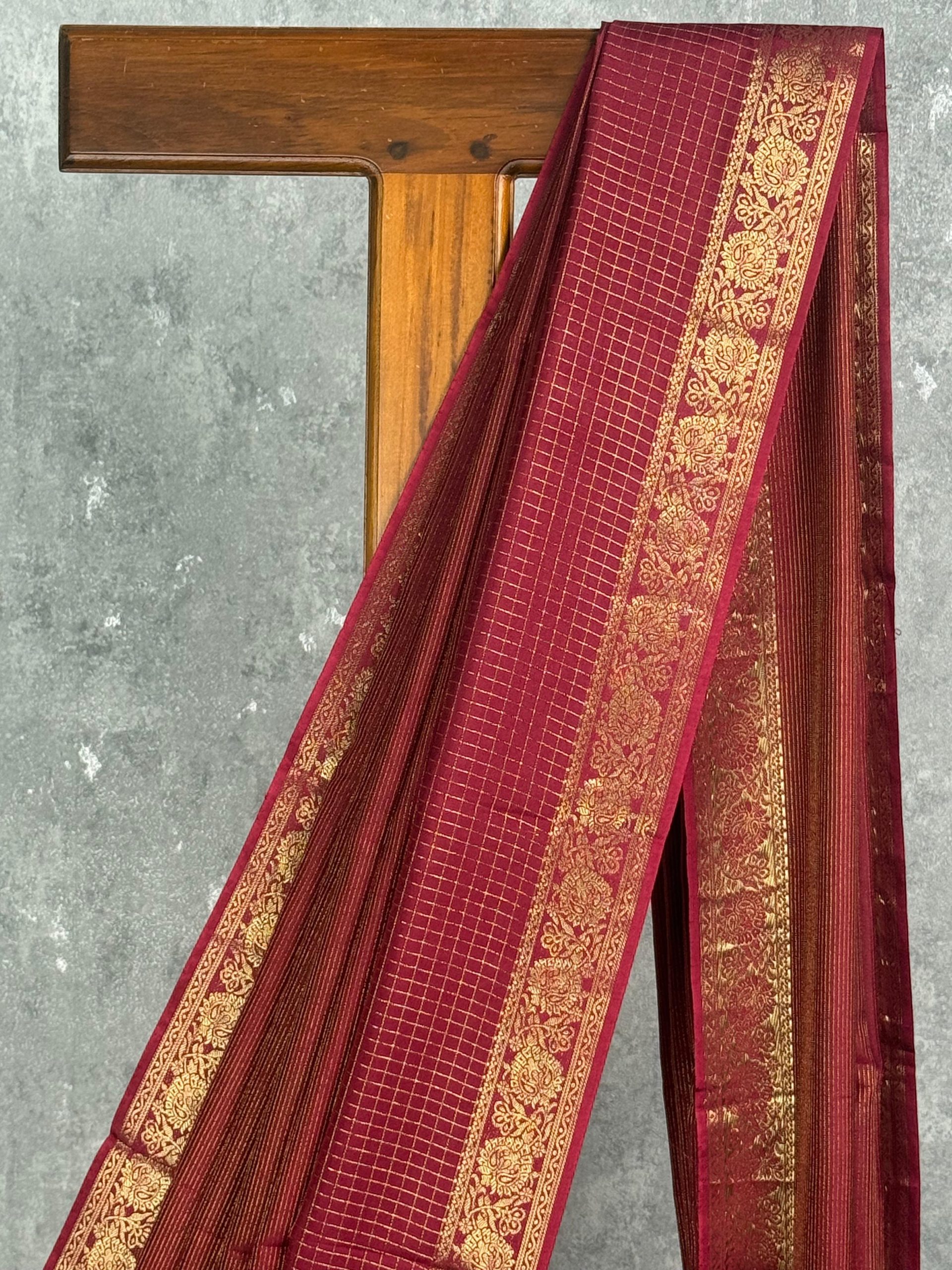 This saree features a rich maroon shade beautifully complemented by intricate gold zari work that enhances its traditional elegance. The checkered pallu and ornate borders add a luxurious touch, making it an ideal choice for festive occasions and cultural celebrations. Its graceful drape and timeless appeal create a truly sophisticated look.