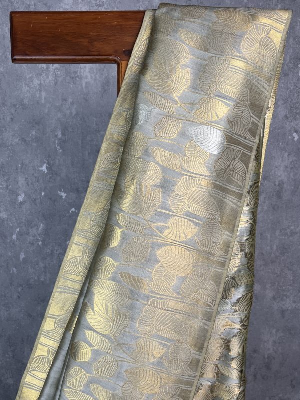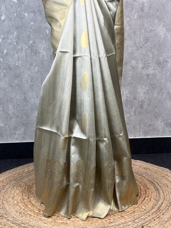Semi tussar raw silk saree with light gold sari woven borders and pallu.Semi tussar silk fabric has silk finish and very light weight and easy to drape. The saree comes with attached self color blouse piece.