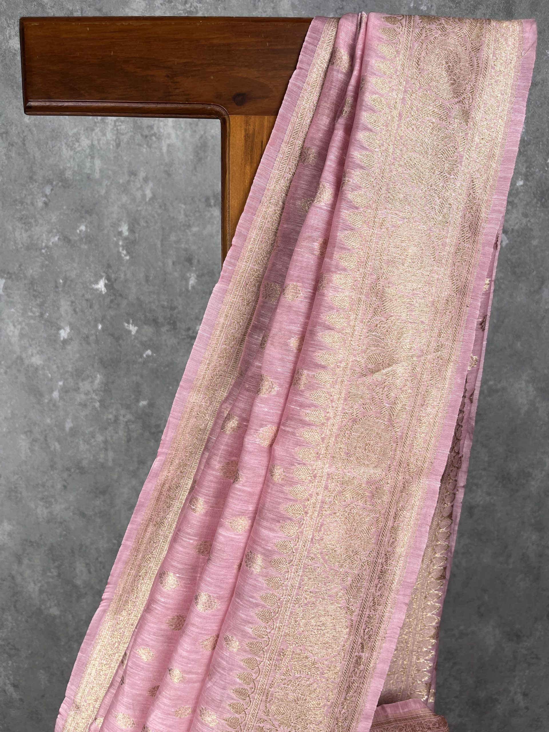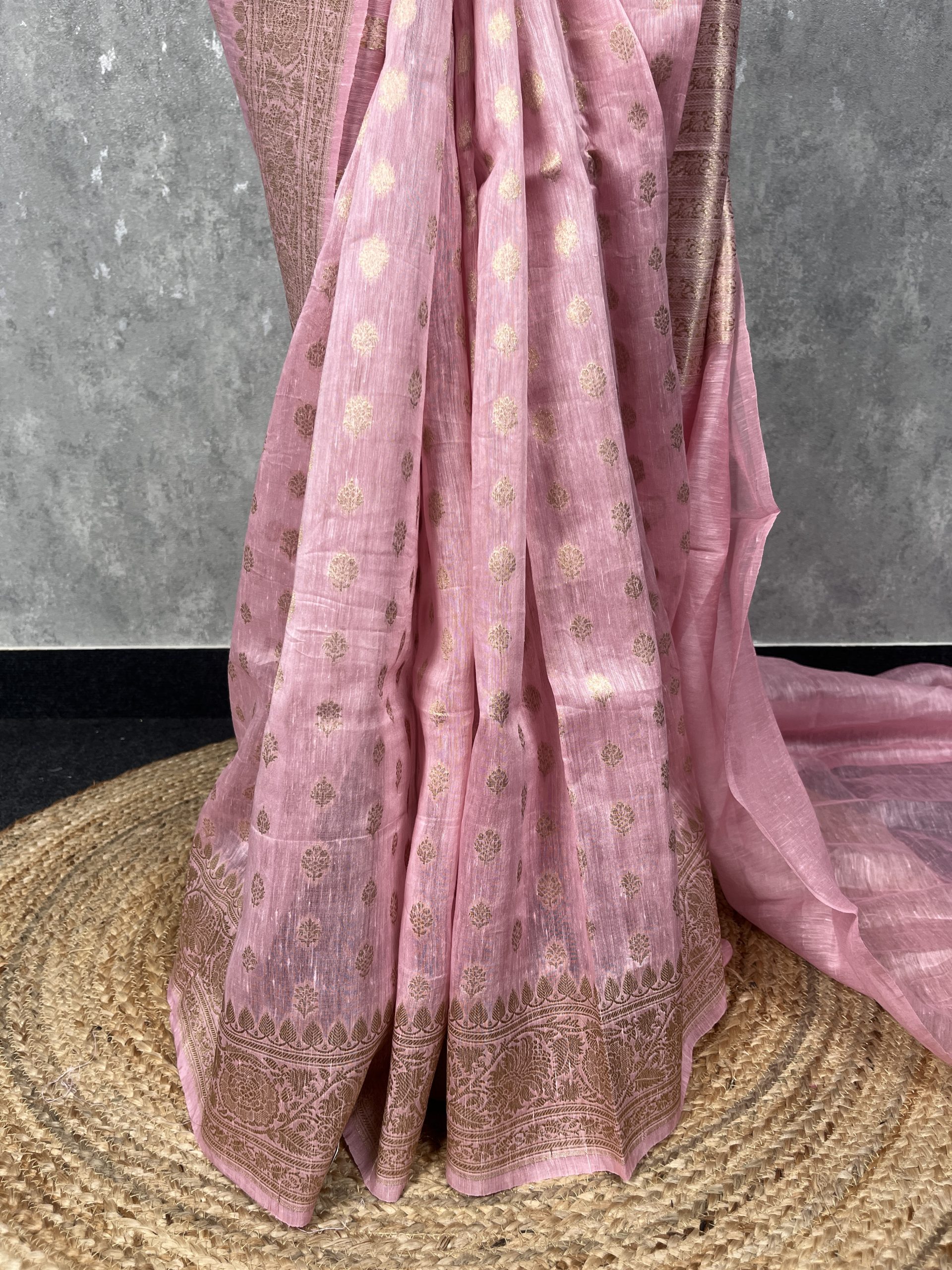 Pure silk linen banarasi saree with light gold zari weave. The saree has bhutas woven all over the body and traditional banarasi woven borders. Silk linen fabric is very breathable light weight and easy to drape.The saree comes with attached self color blouse piece.