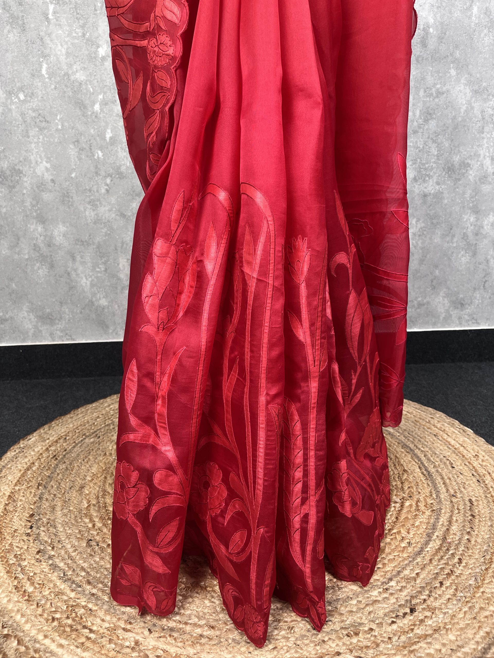 Pure silk organza saree with self color applique embroidery all over the body. The border has cutwork edges. The saree has attached self color blouse piece.
