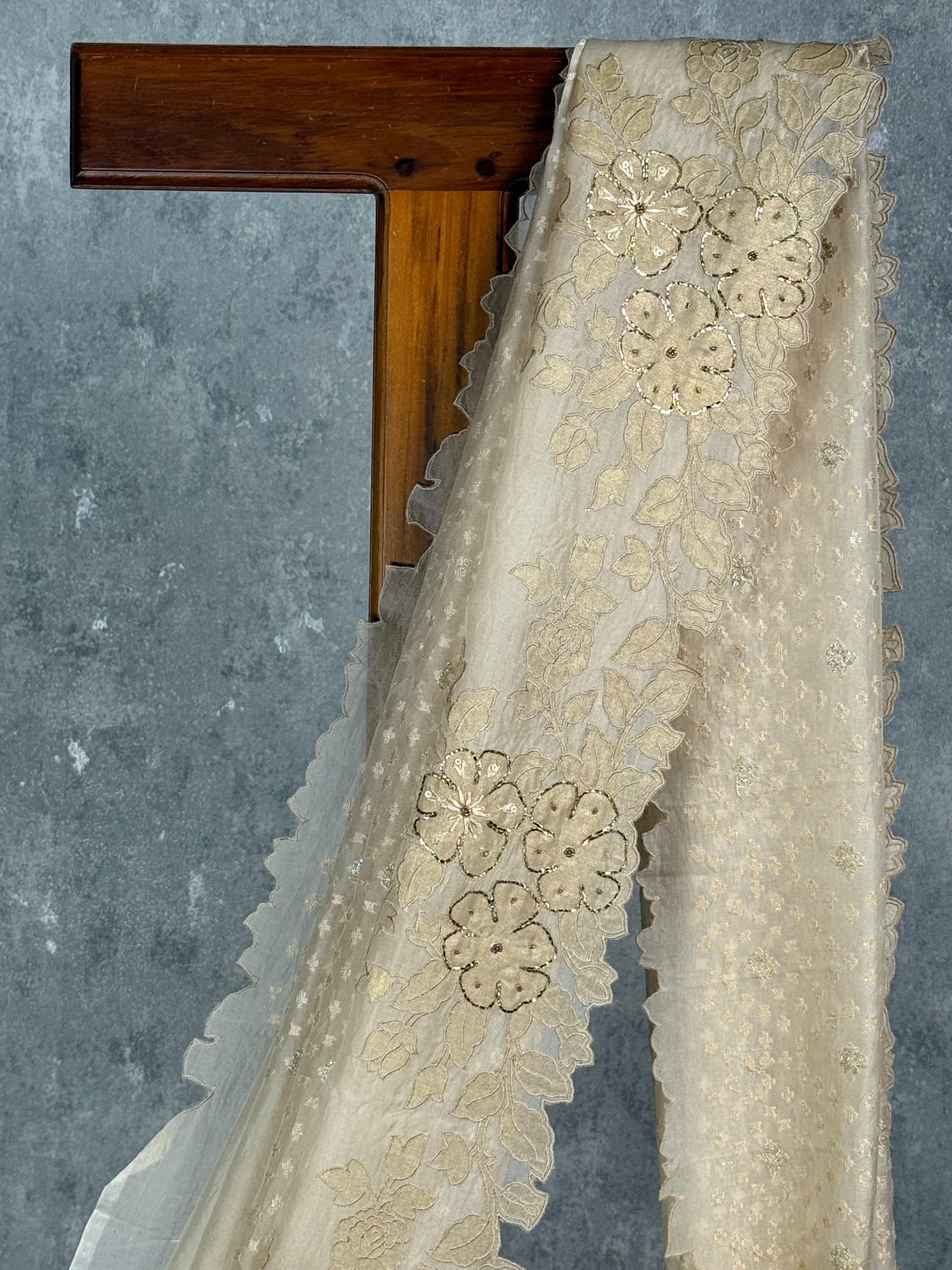 This stunning beige saree exudes timeless sophistication with its intricate floral embroidery and delicate woven patterns. The subtle sheen and elegant detailing add a regal charm, making it perfect for festive celebrations or formal occasions. Graceful and refined, it beautifully blends tradition with modern allure.