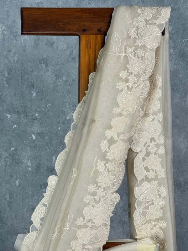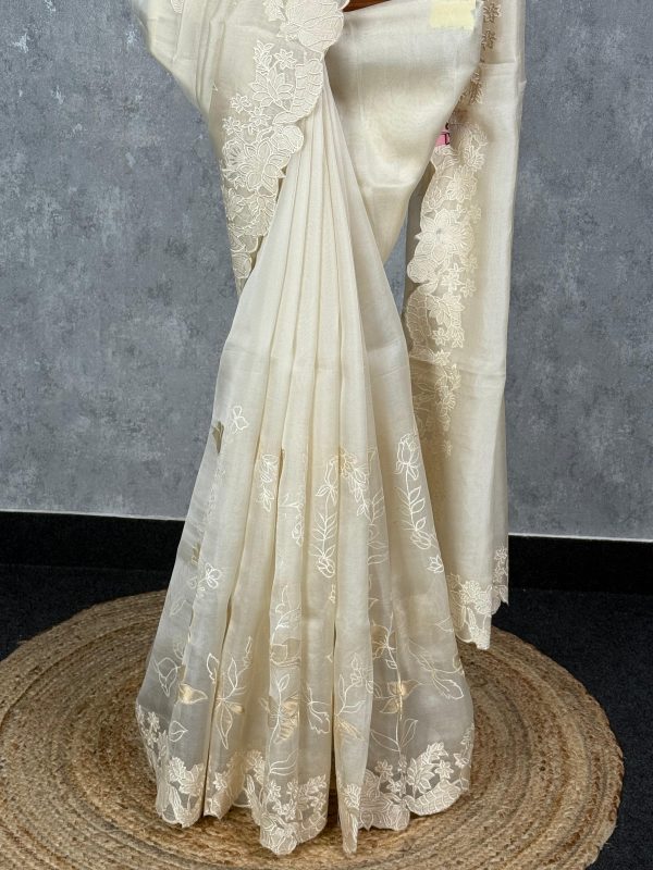 This stunning cream saree exudes understated elegance with its beautifully detailed floral embroidery and scalloped border. The soft, sheer fabric drapes gracefully, making it a perfect choice for sophisticated occasions and timeless celebrations.