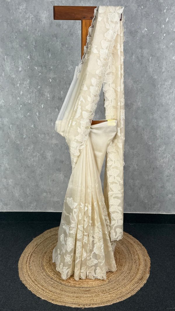 This elegant off-white saree showcases exquisite floral embroidery that adds a touch of sophistication and charm. The delicate scalloped border enhances its timeless beauty, making it a perfect choice for festive and formal occasions alike.