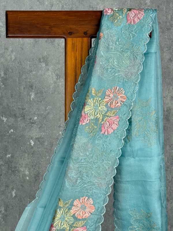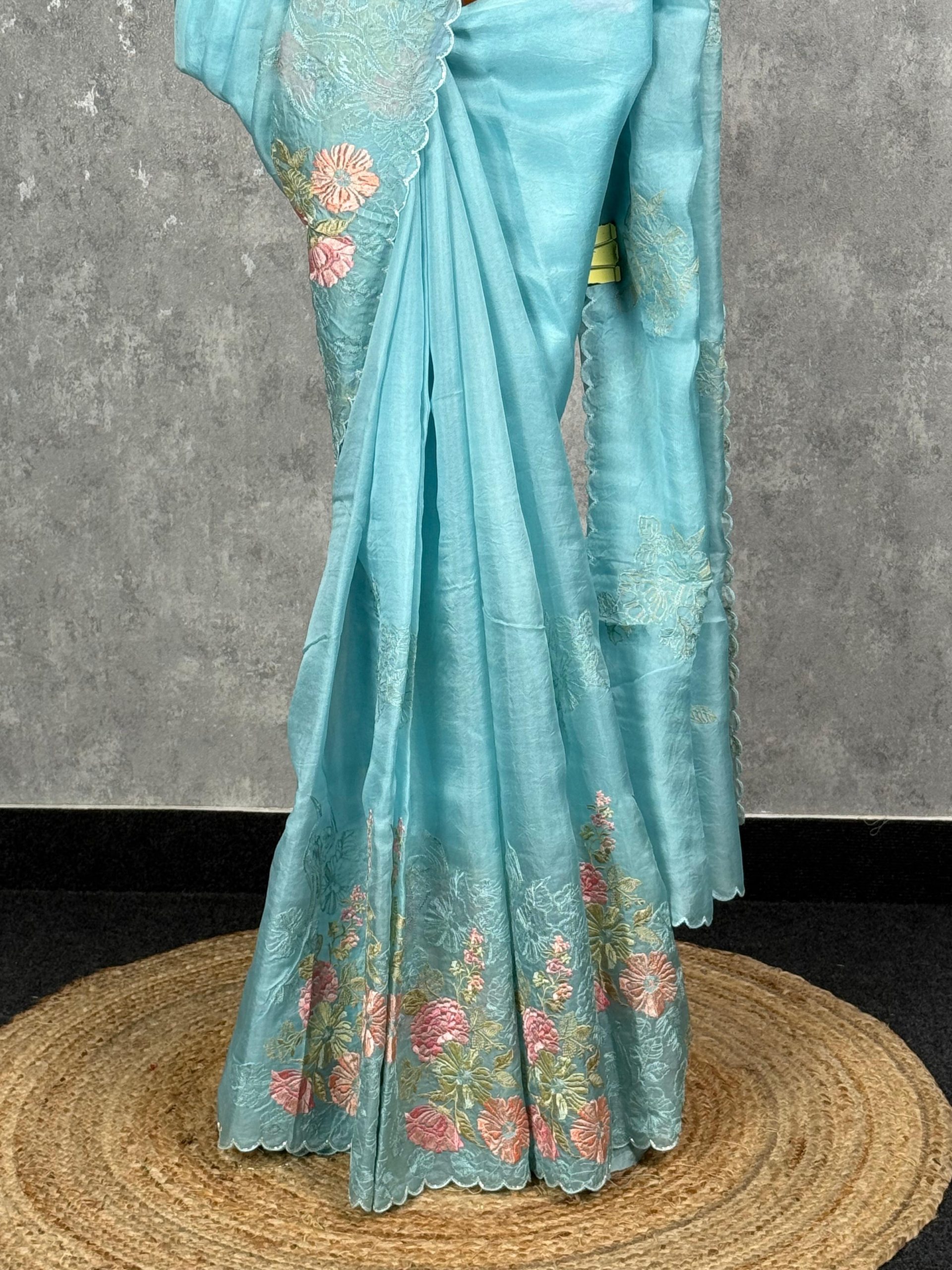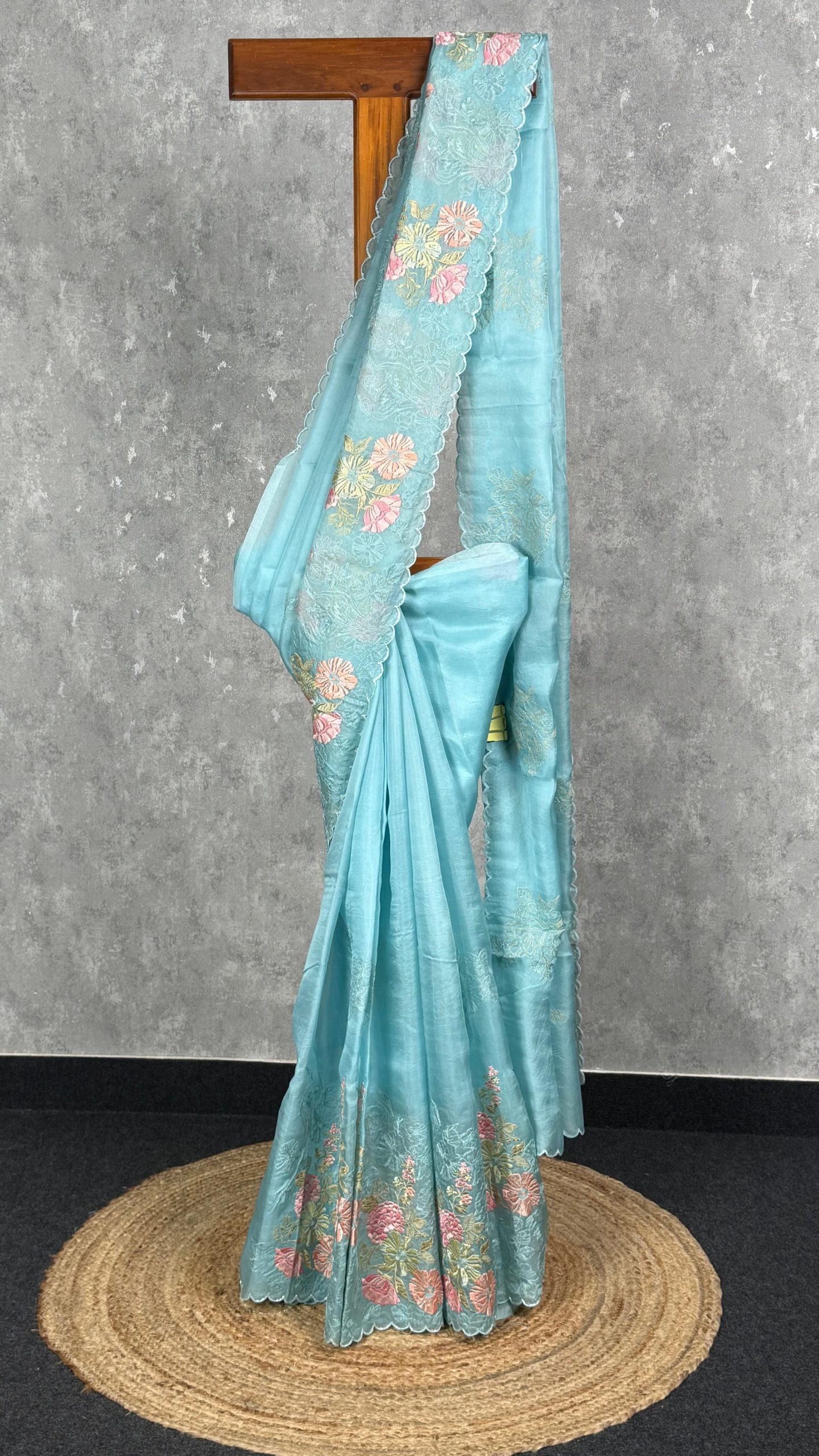 This elegant saree in a soothing sky-blue shade exudes grace and sophistication. Adorned with delicate floral embroidery in pastel hues along the borders and pallu, it beautifully blends tradition with contemporary charm. Perfect for festive occasions or daytime celebrations, it adds a touch of effortless elegance to any look.