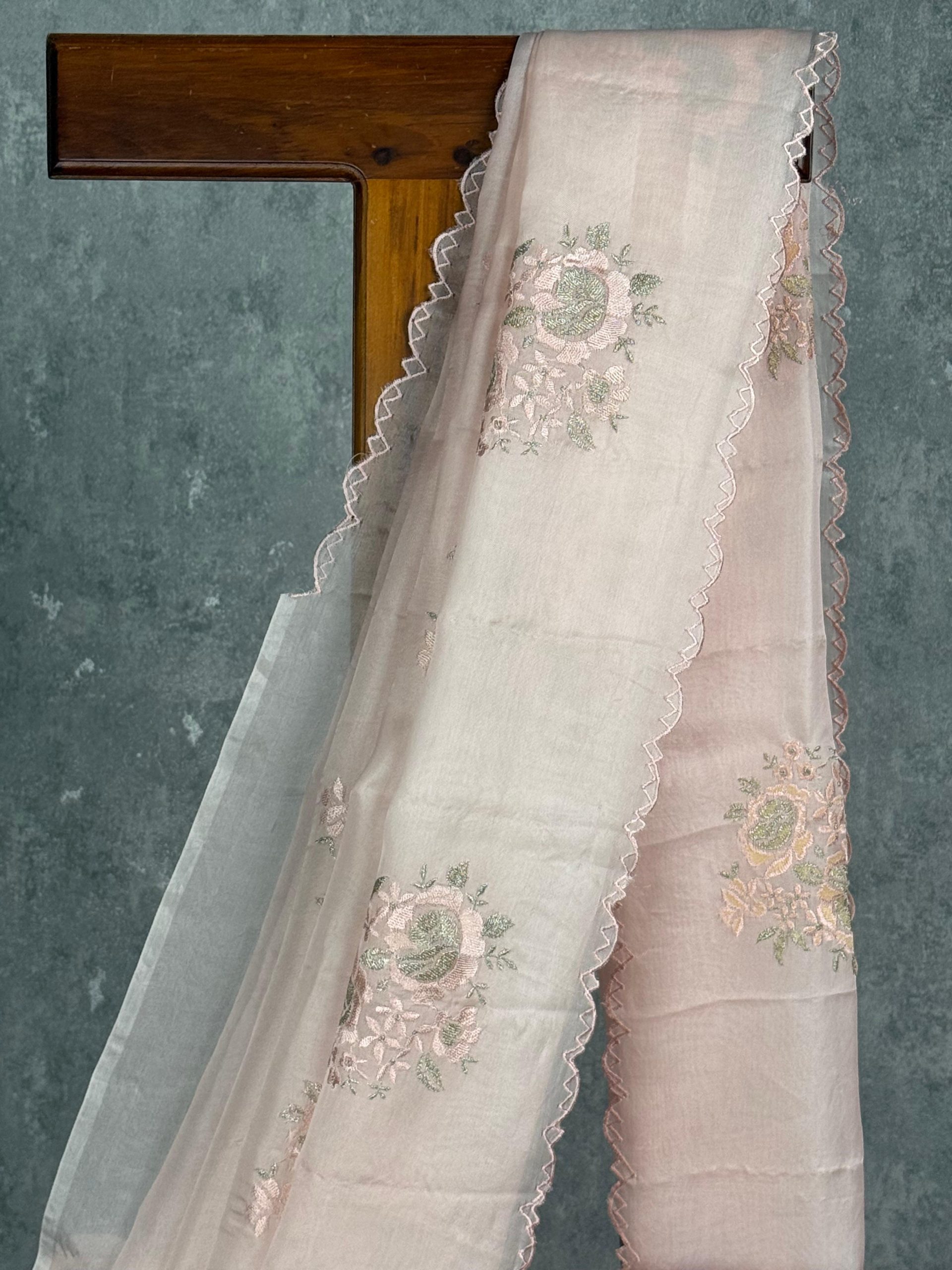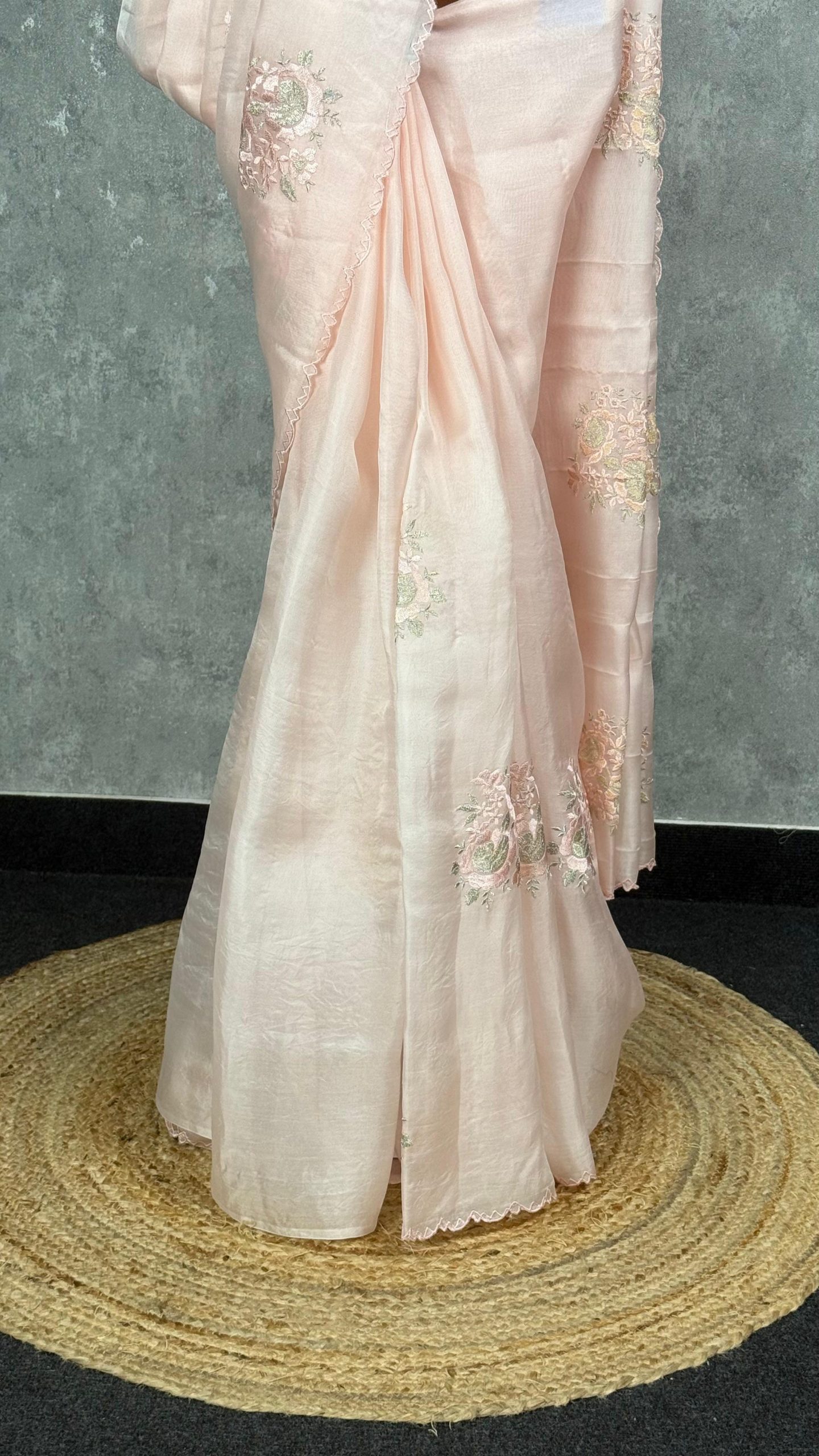 This beautiful saree in a soft peach hue exudes subtle elegance and grace. Adorned with delicate floral embroidery and scalloped borders, it offers a perfect blend of charm and sophistication. Ideal for festive occasions or daytime events, it adds a refreshing touch to your ethnic wardrobe.