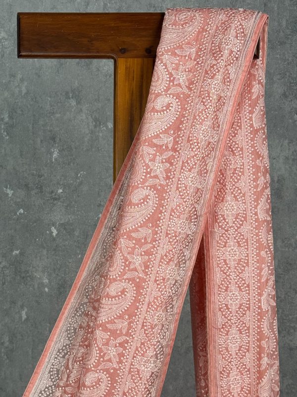 This beautiful saree in a soft peach tone exudes understated elegance and charm. The intricate white thread embroidery with paisley and floral motifs enhances its graceful appeal. Perfect for festive occasions or daytime celebrations, it offers a timeless and sophisticated look.