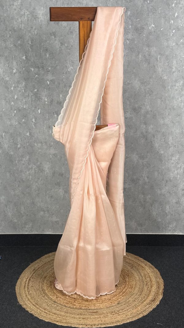 This elegant saree in a soft peach hue exudes timeless sophistication and grace. The delicate scalloped border adds a touch of refined beauty, making it perfect for minimal yet classy occasions. Its lightweight fabric drapes effortlessly, enhancing the wearer’s natural elegance.