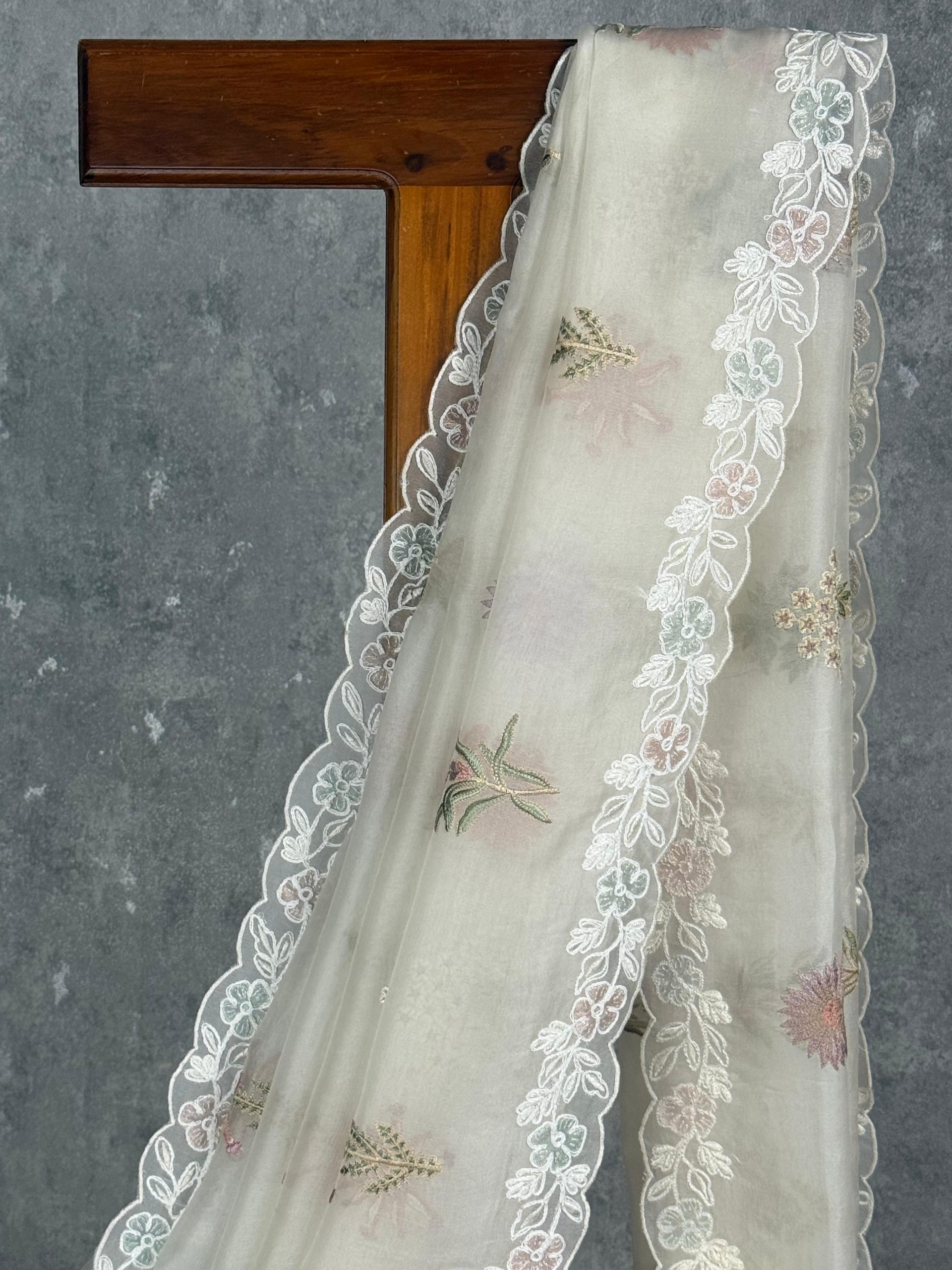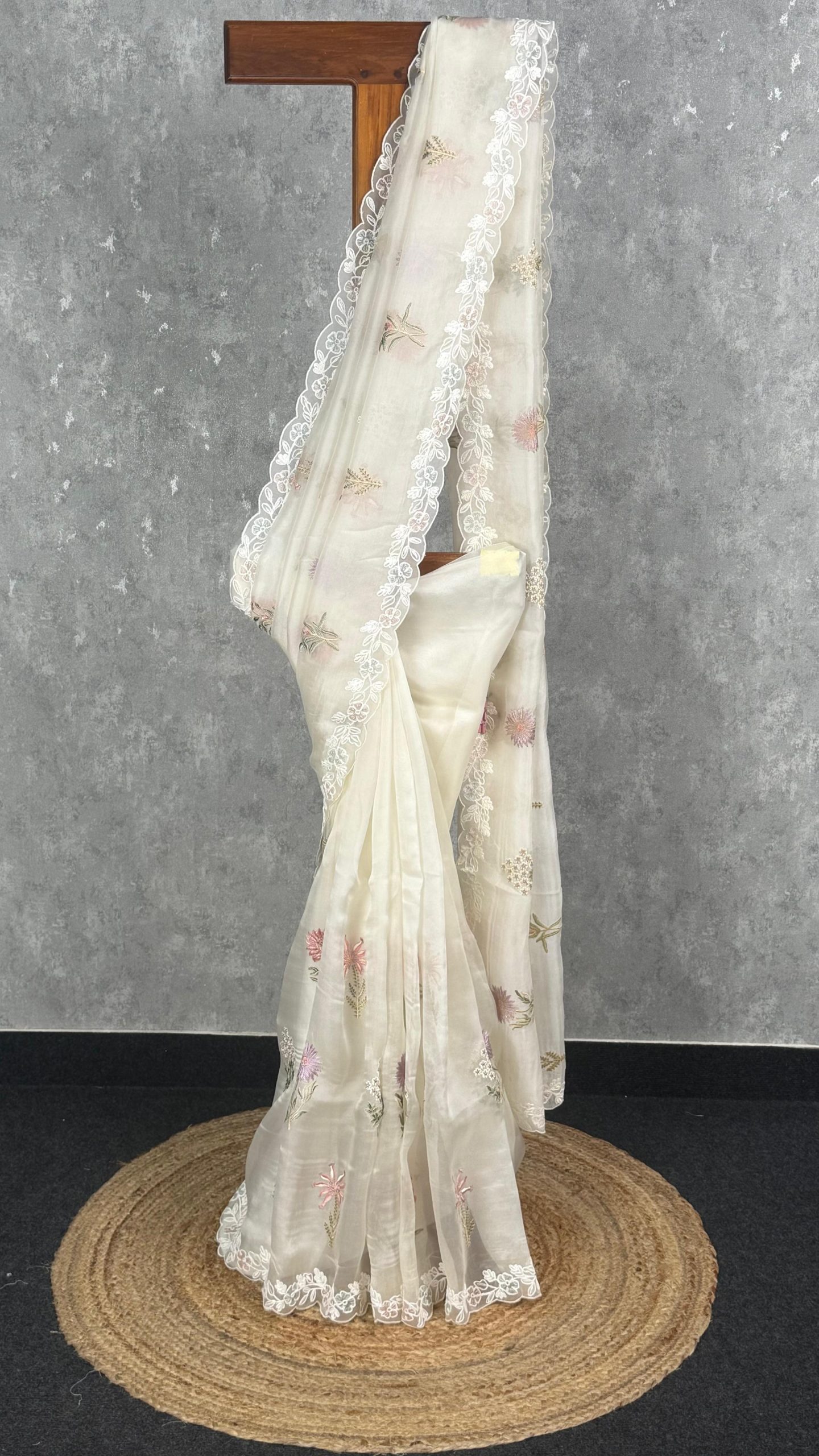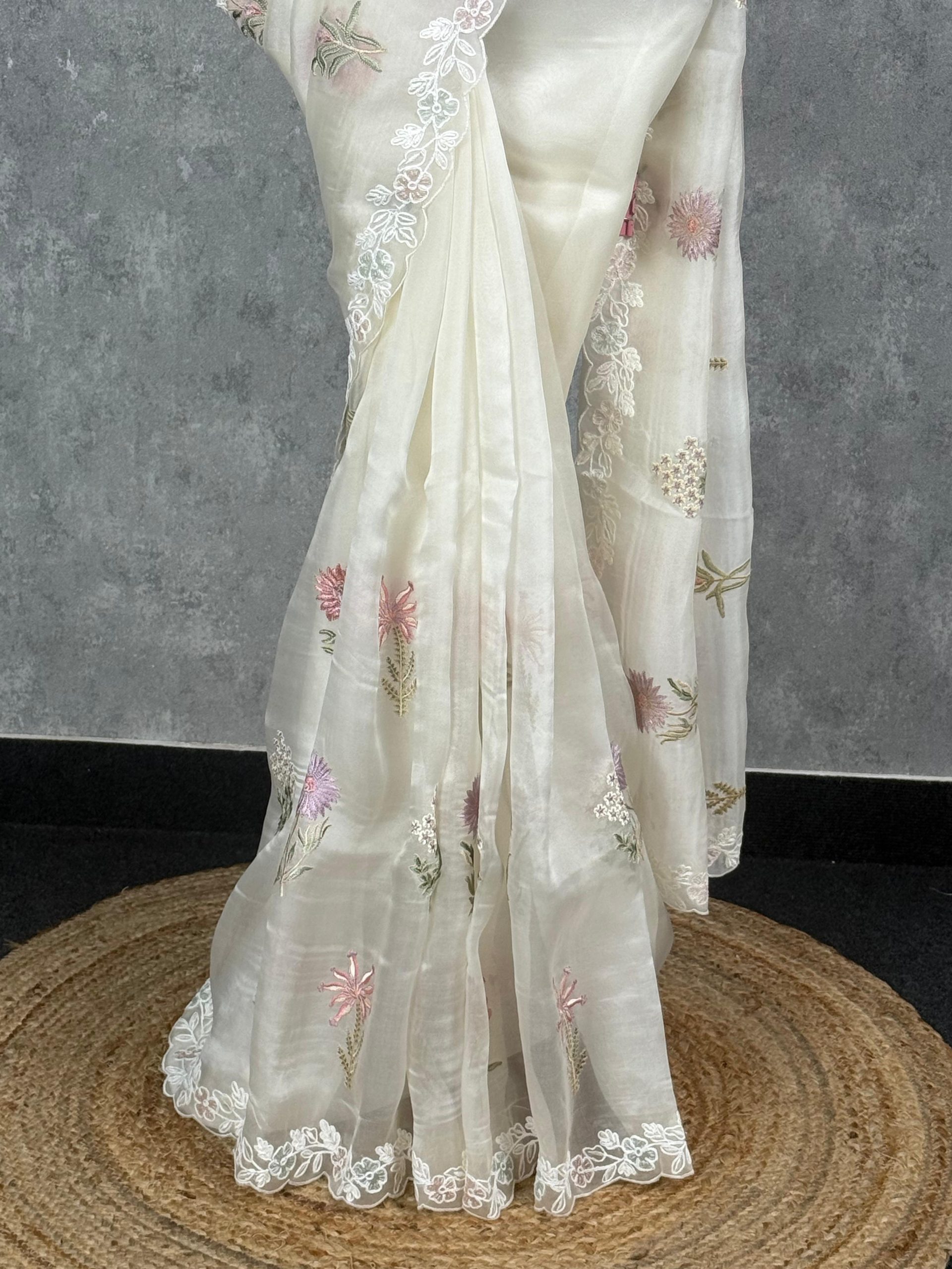 This elegant saree exudes timeless grace with its soft ivory hue and delicate floral embroidery. The lightweight fabric drapes beautifully, enhanced by a scalloped lace border that adds a touch of sophistication. Perfect for daytime celebrations or elegant evening gatherings, it combines subtle charm with refined style.
