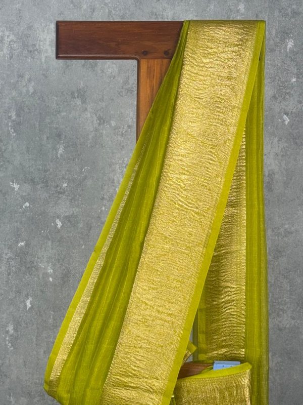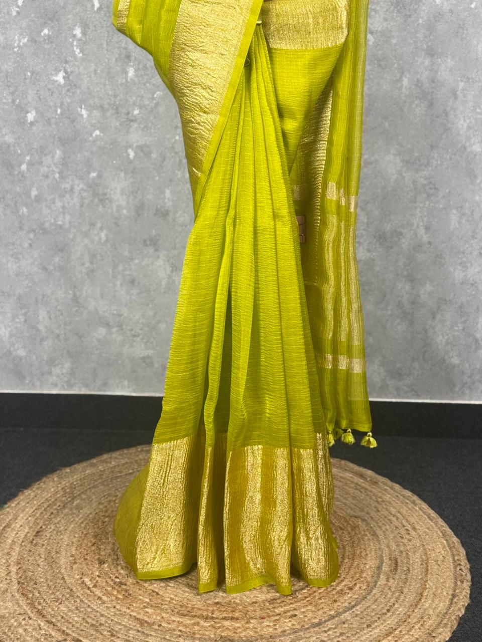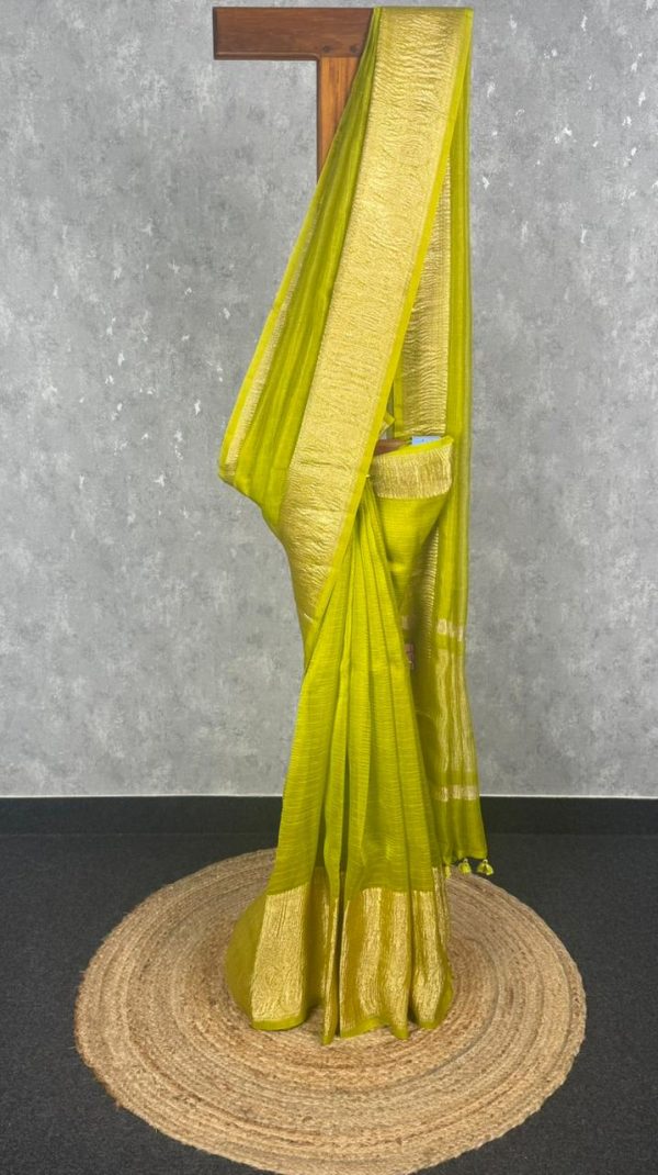This elegant lime green saree features a rich golden zari border and pallu, adding a touch of luxury and tradition. Its lightweight fabric drapes beautifully, making it perfect for festive and formal occasions.