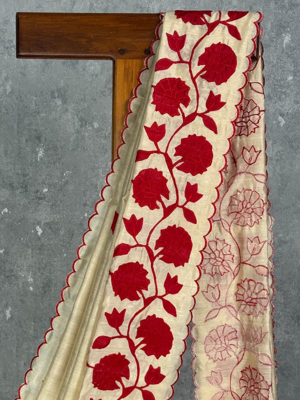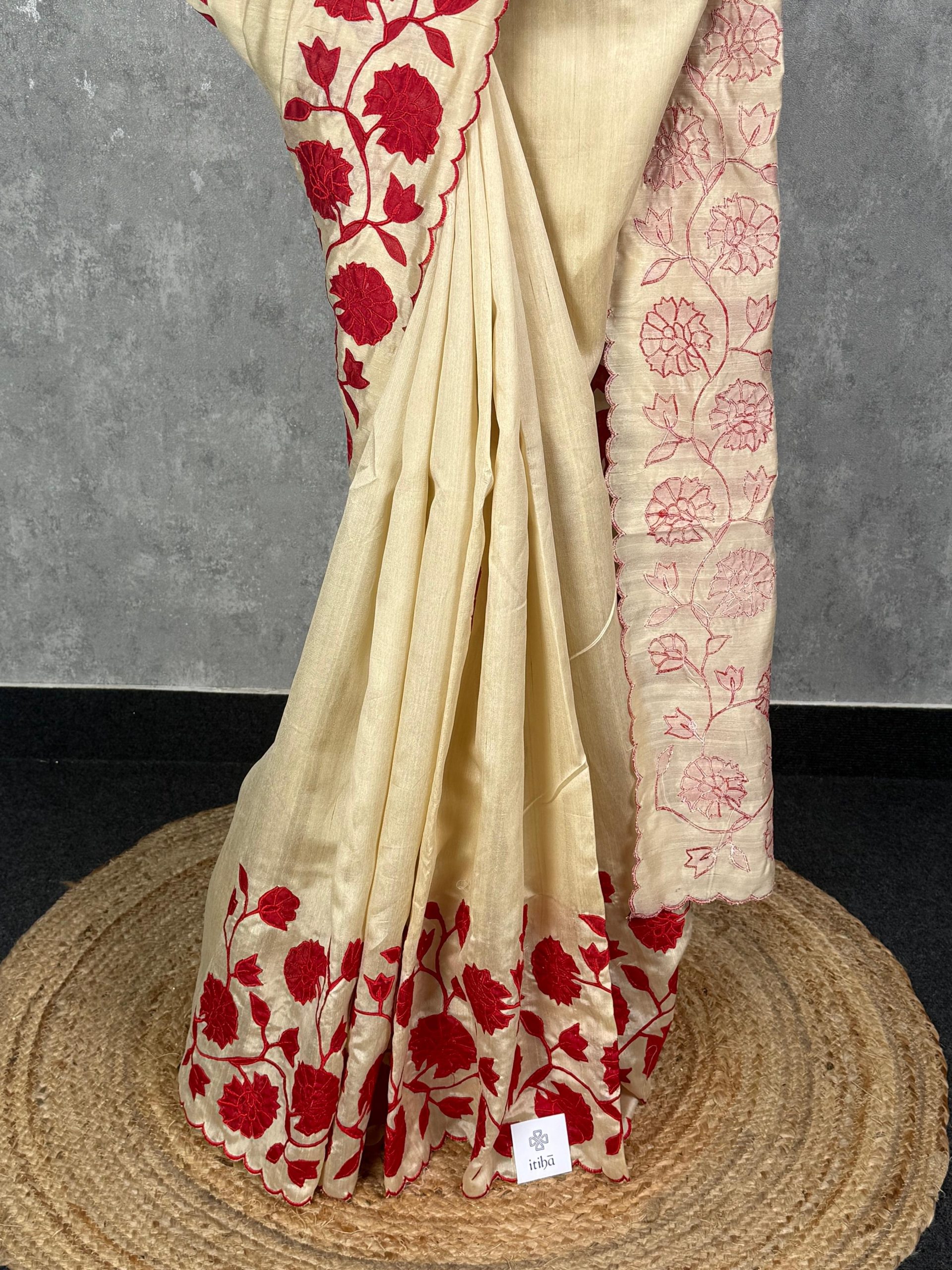 This stunning saree beautifully blends tradition and elegance with its cream base and bold red floral embroidery. The intricate threadwork on the border and pallu adds a striking contrast, creating a timeless statement piece. Perfect for festive occasions, it exudes grace and vibrant sophistication.