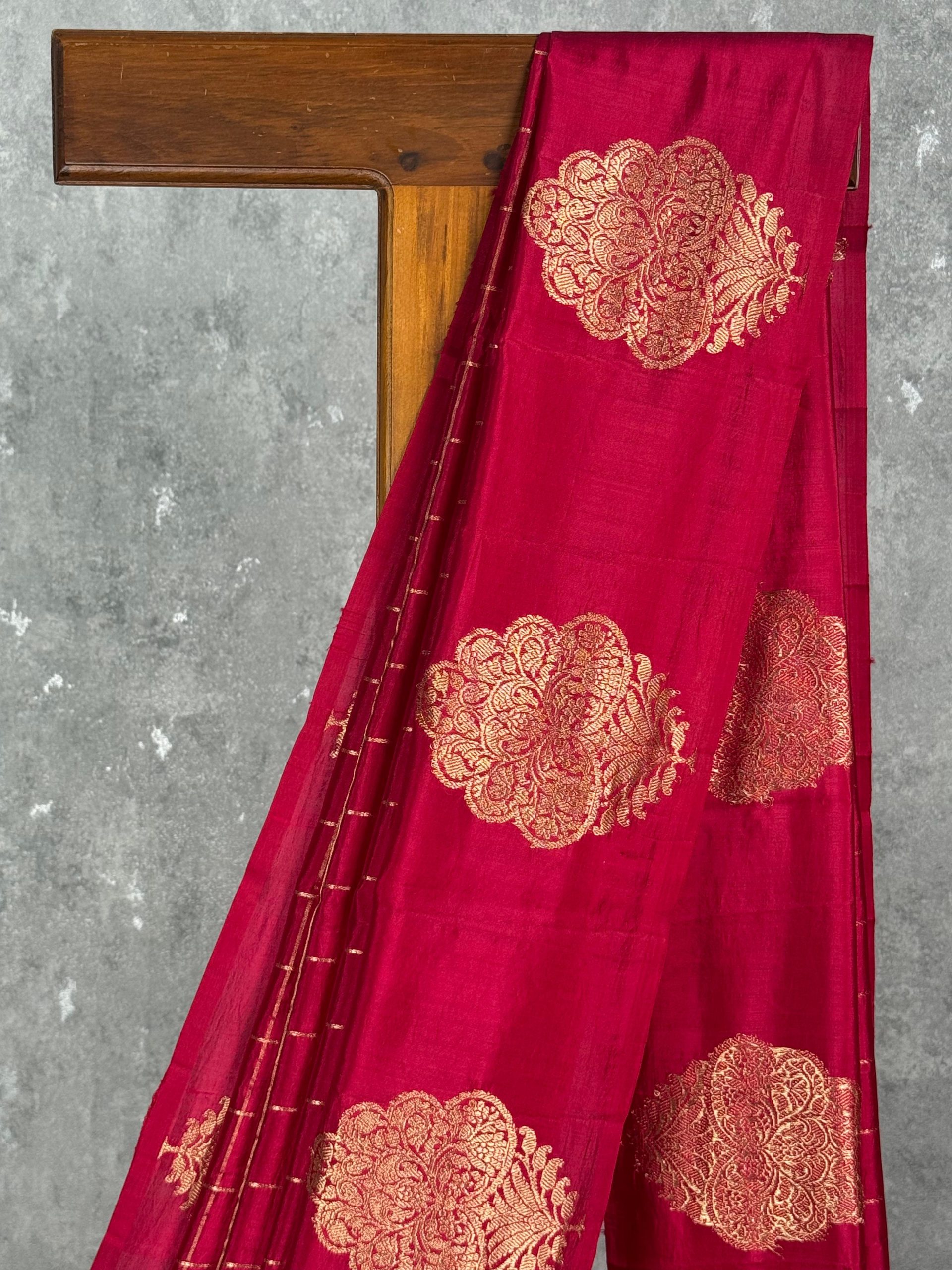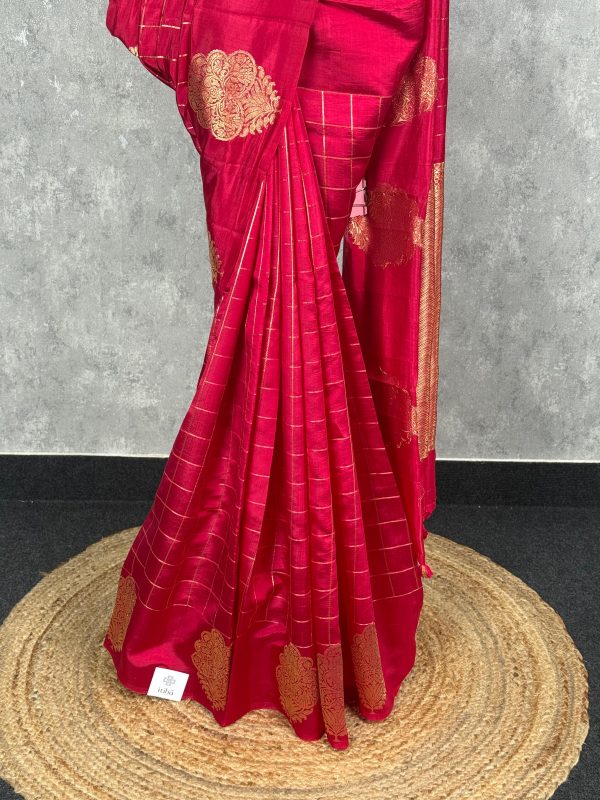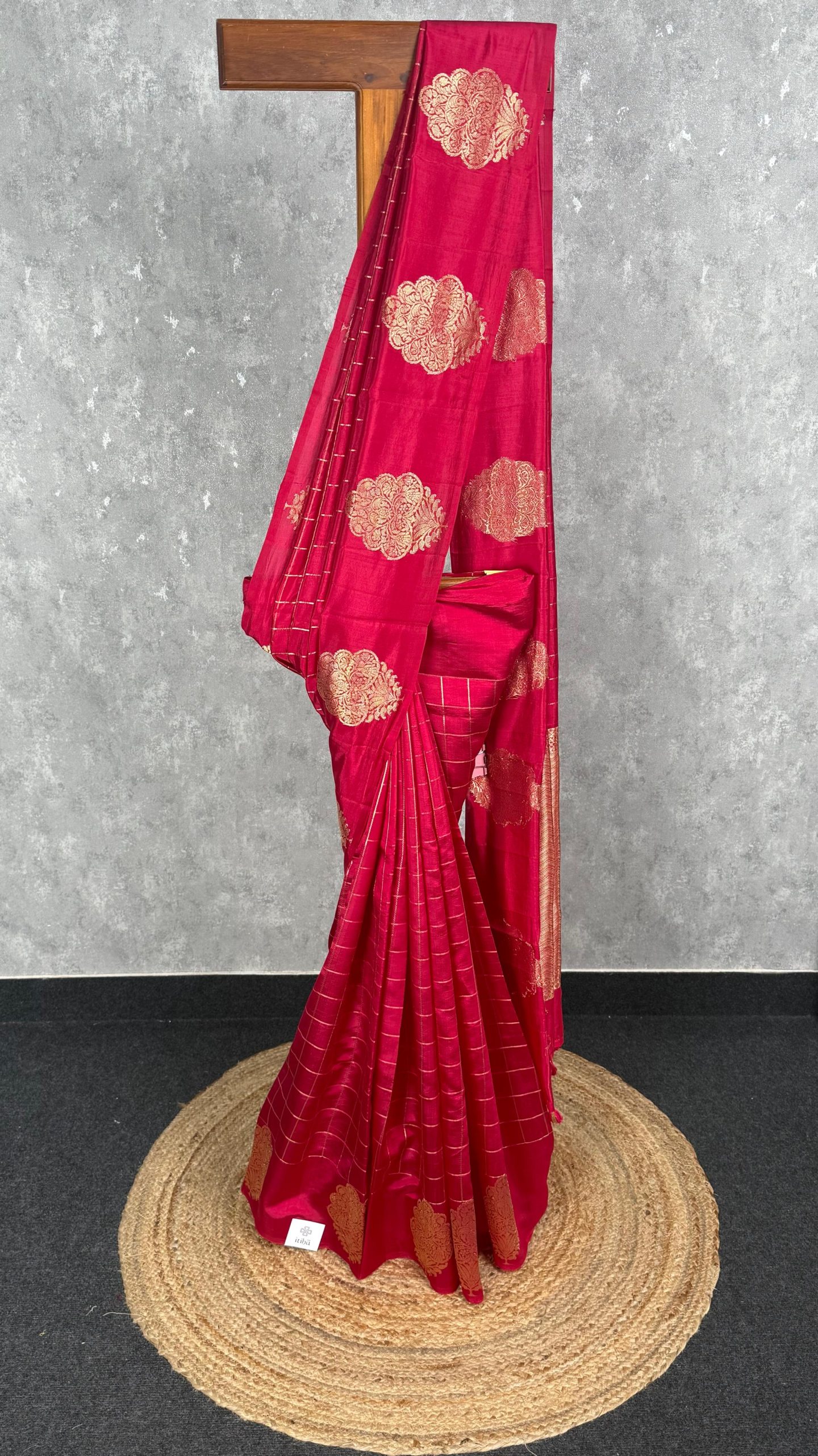 This stunning saree in a rich crimson red shade exudes regal elegance and charm. Adorned with intricate golden motifs and subtle check patterns, it beautifully blends traditional craftsmanship with a timeless appeal. Perfect for festive celebrations or grand occasions, this saree makes a bold and graceful statement.