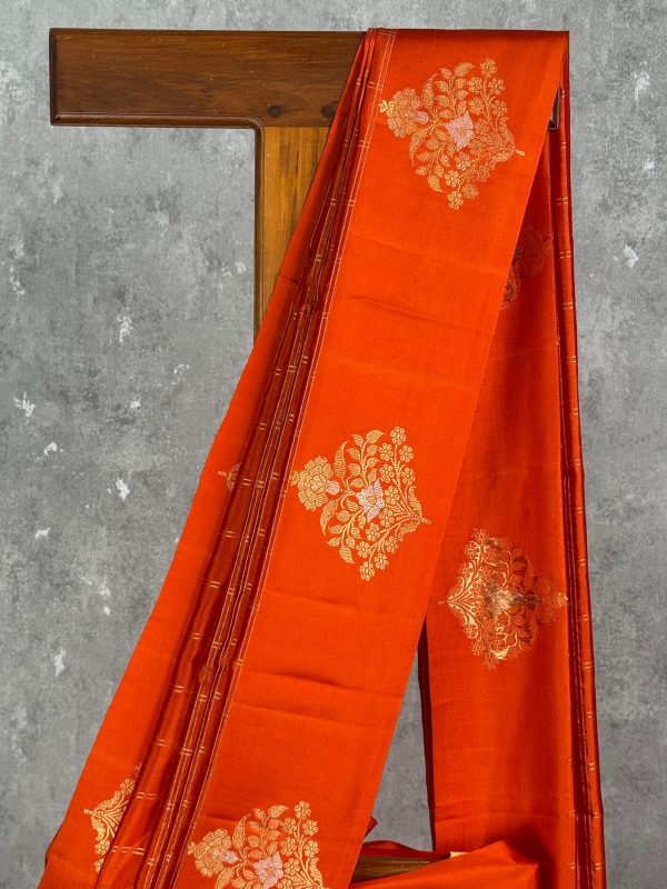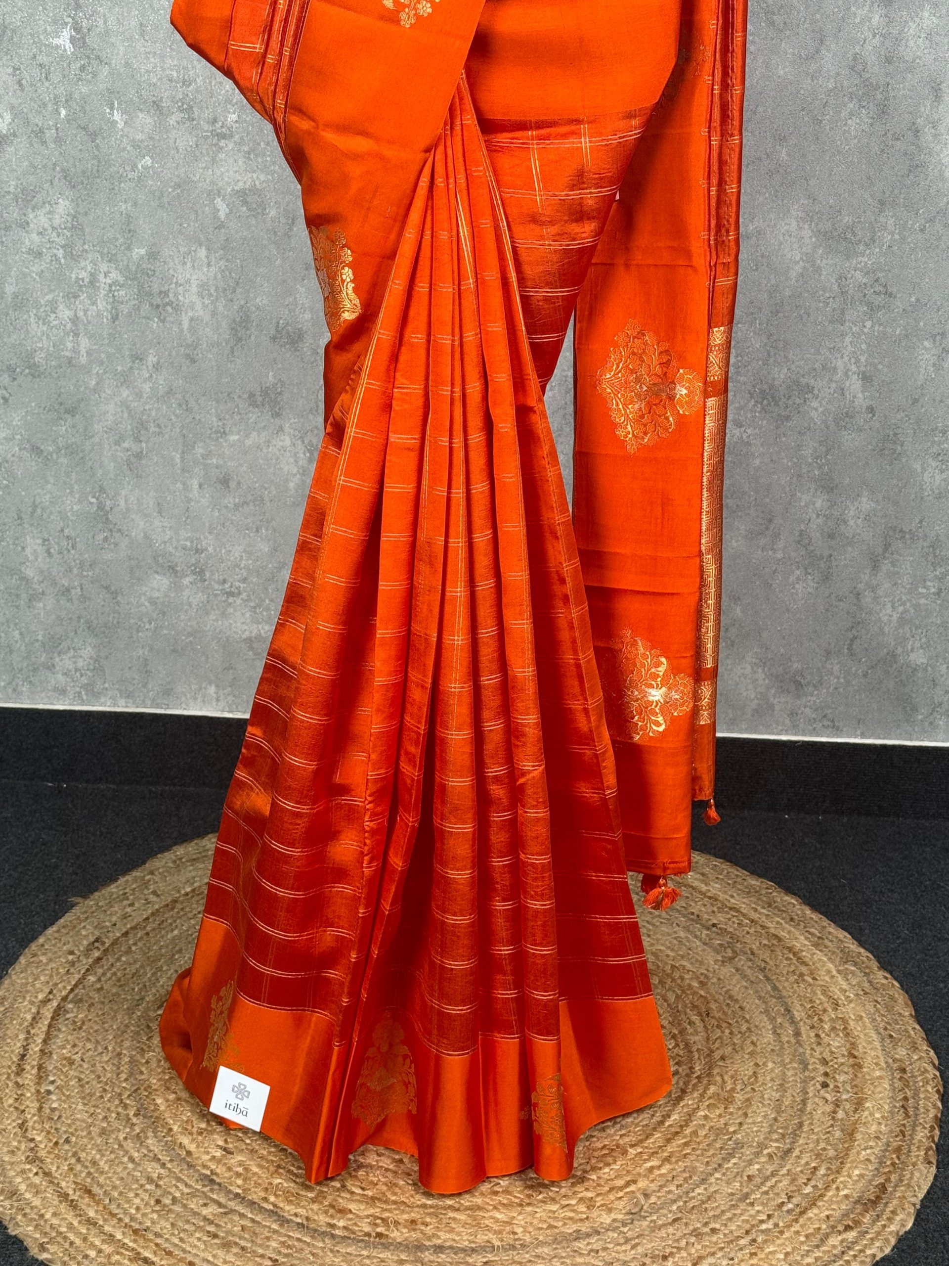 This vibrant saree in a rich orange hue radiates warmth and festive charm. The intricate golden motifs and checked patterns add a touch of sophistication, making it perfect for traditional celebrations and grand occasions. Its lustrous finish enhances the regal appeal of the ensemble