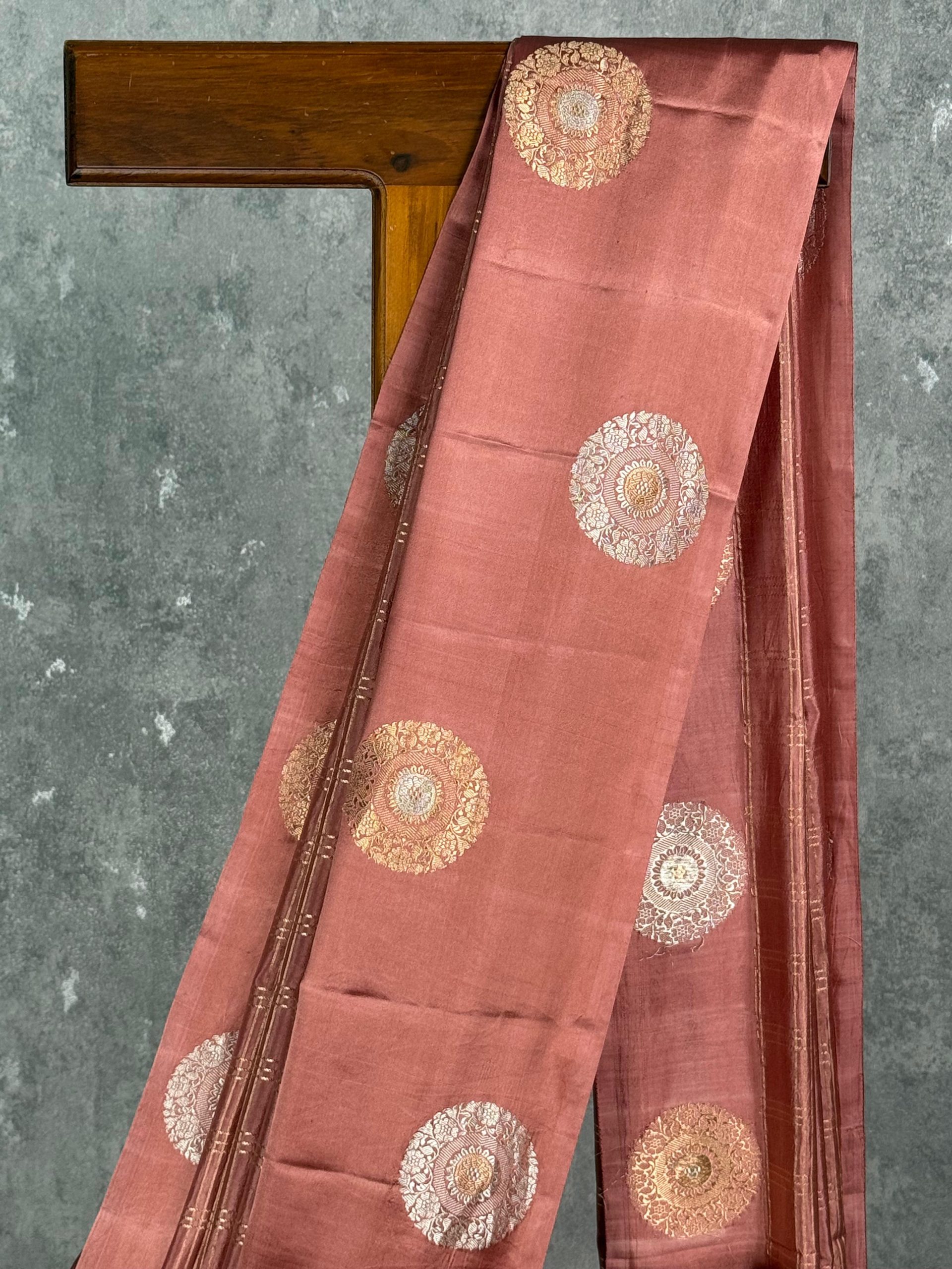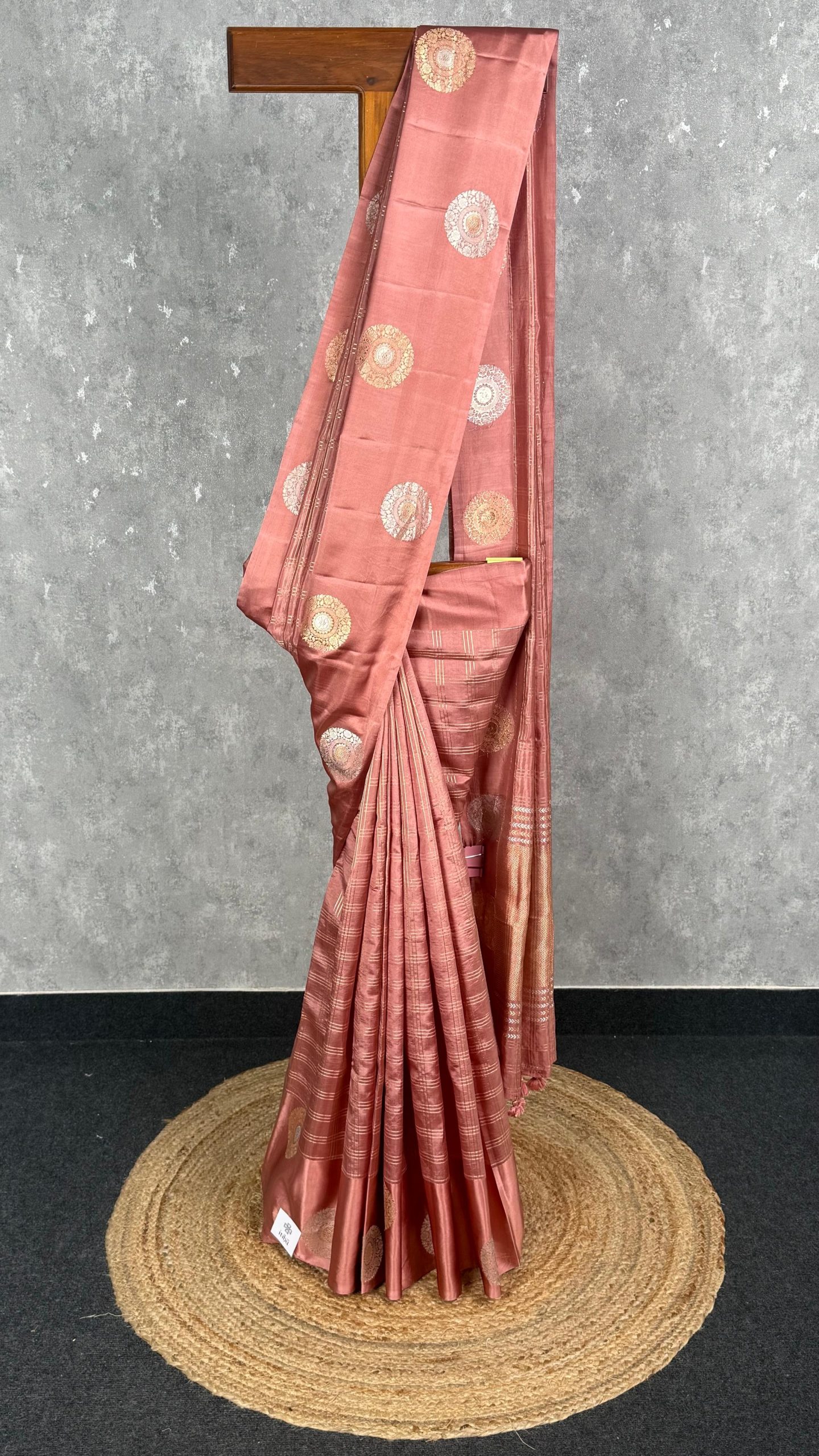This exquisite saree in a muted rose gold hue radiates timeless sophistication. The delicate circular motifs woven across the fabric add a touch of traditional artistry, while the lustrous texture enhances its graceful appeal. Perfect for festive celebrations or elegant gatherings, this saree beautifully combines classic charm with modern refinement.