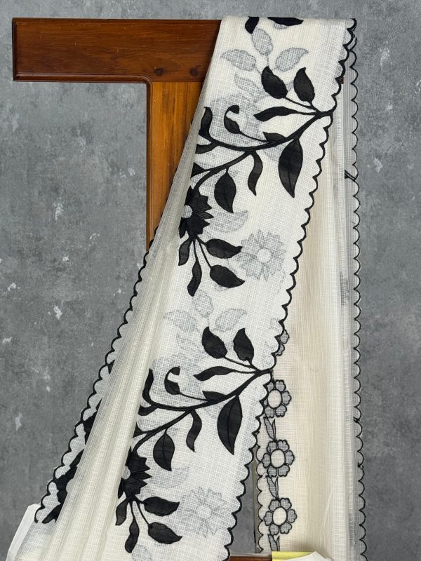 This elegant saree showcases a serene ivory base adorned with striking black floral embroidery, creating a timeless monochrome charm. The scalloped borders and intricate threadwork enhance its refined appeal. Perfect for formal occasions or cultural gatherings, it exudes effortless sophistication and grace.