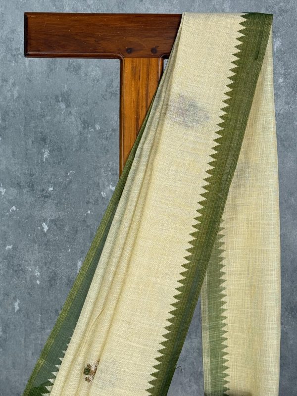 This graceful cream saree features a refined olive-green border that adds a touch of earthy elegance. Adorned with delicate floral embroidery, it perfectly blends simplicity with sophistication, making it ideal for festive and traditional occasions.