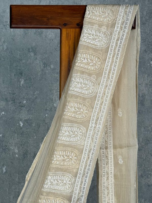 This saree exudes timeless grace with its elegant cream-beige tone and intricate white thread embroidery. The delicate motifs and soft, sheer drape add a refined charm, making it perfect for sophisticated daytime events or traditional celebrations. Its understated beauty highlights effortless elegance in every fold.