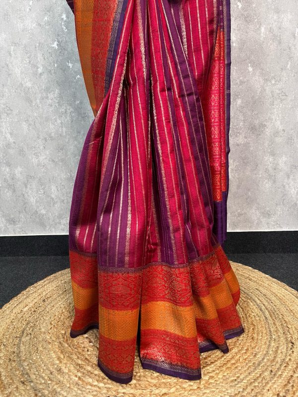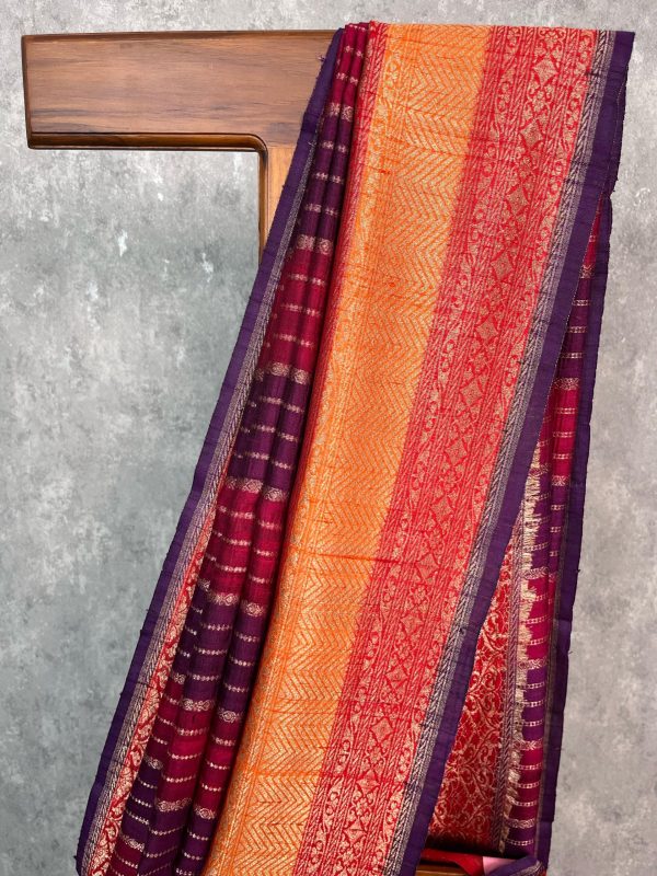 Pure handloom tussar raw silk saree with antique zari vertical lines all through the body. This is a rangkhat saree and dyed in shades of pink , yellow and purple. The saree has attached self color blouse piece with zari border on sleeve ends.