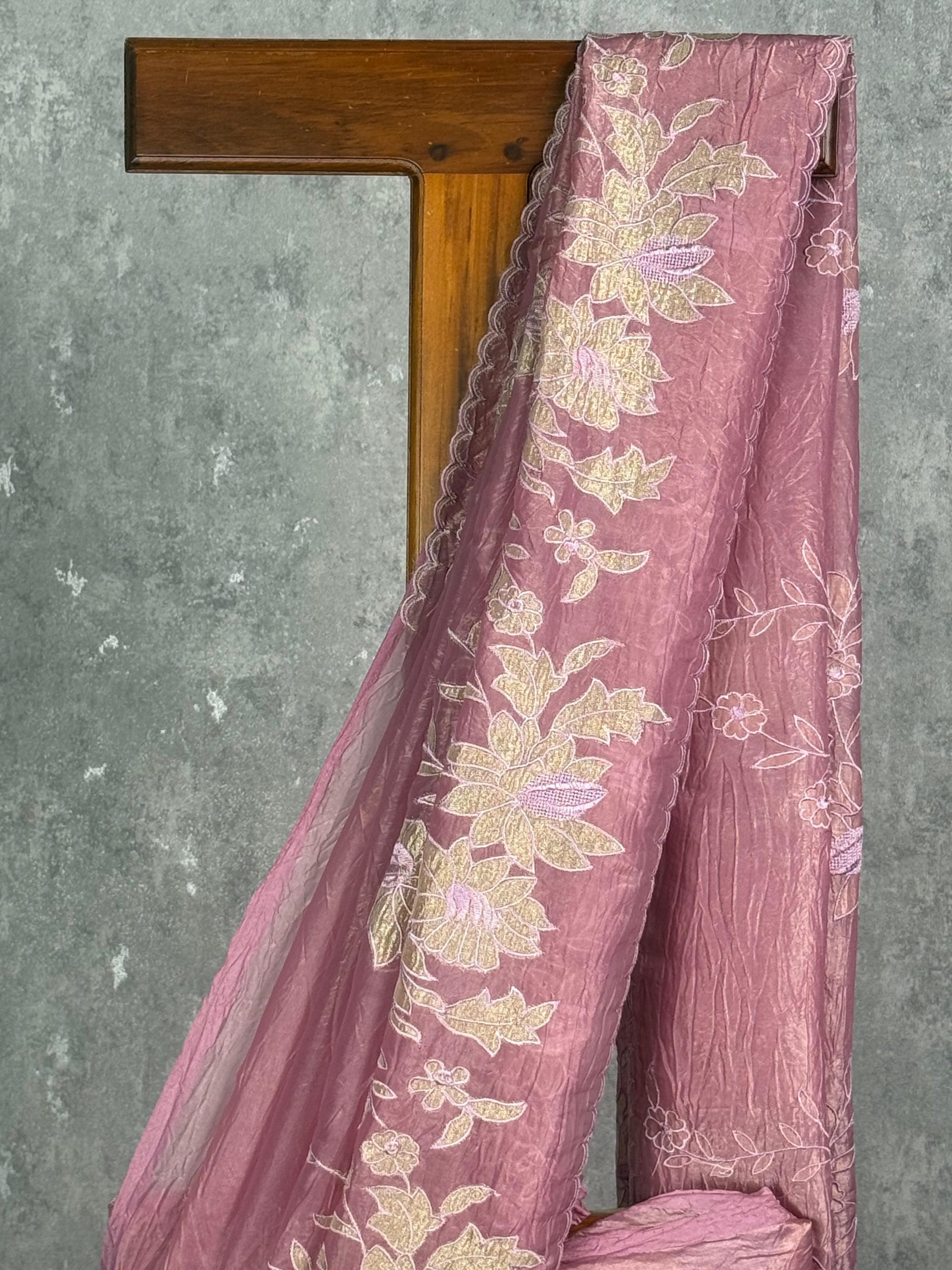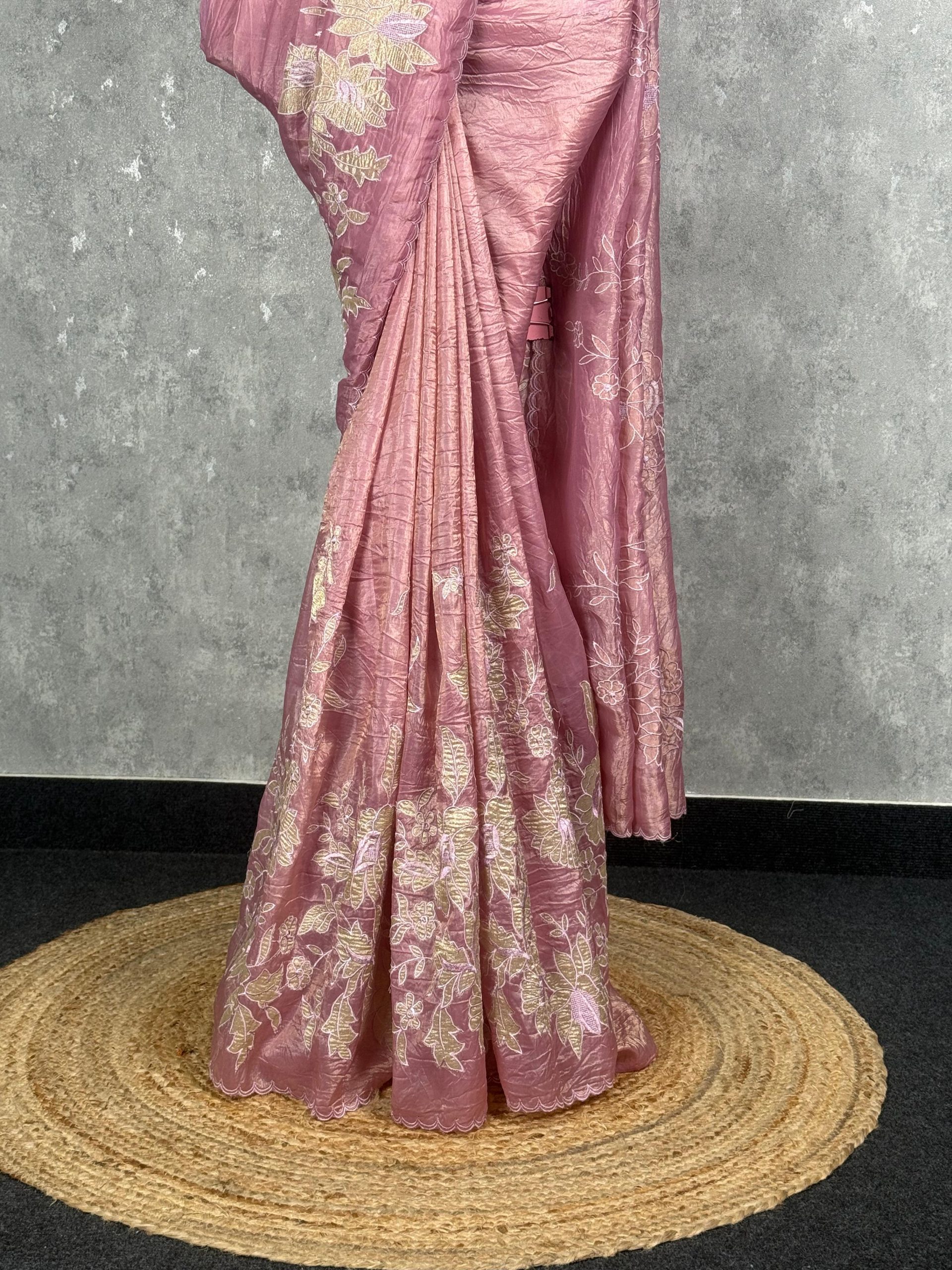 This elegant mauve saree is beautifully adorned with intricate floral embroidery, giving it a rich and graceful look. The soft shimmer of the fabric enhances its sophistication, making it perfect for festive or formal occasions. Its delicate hue adds a touch of modern charm to traditional elegance.
