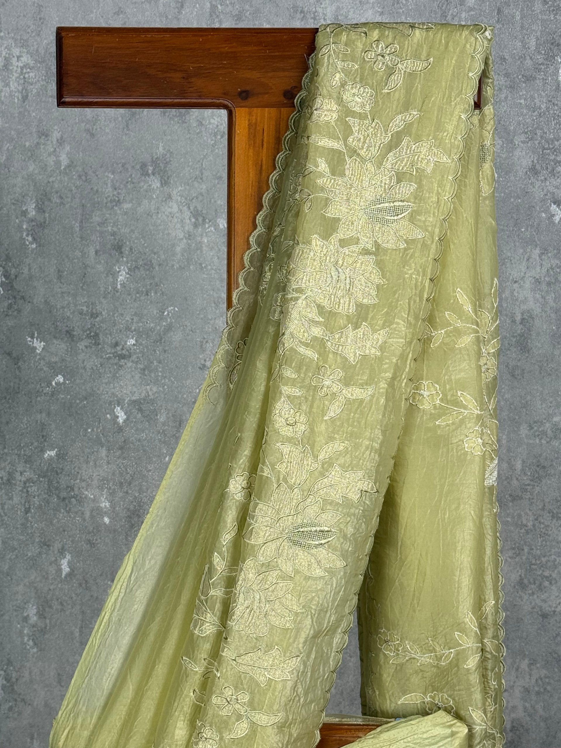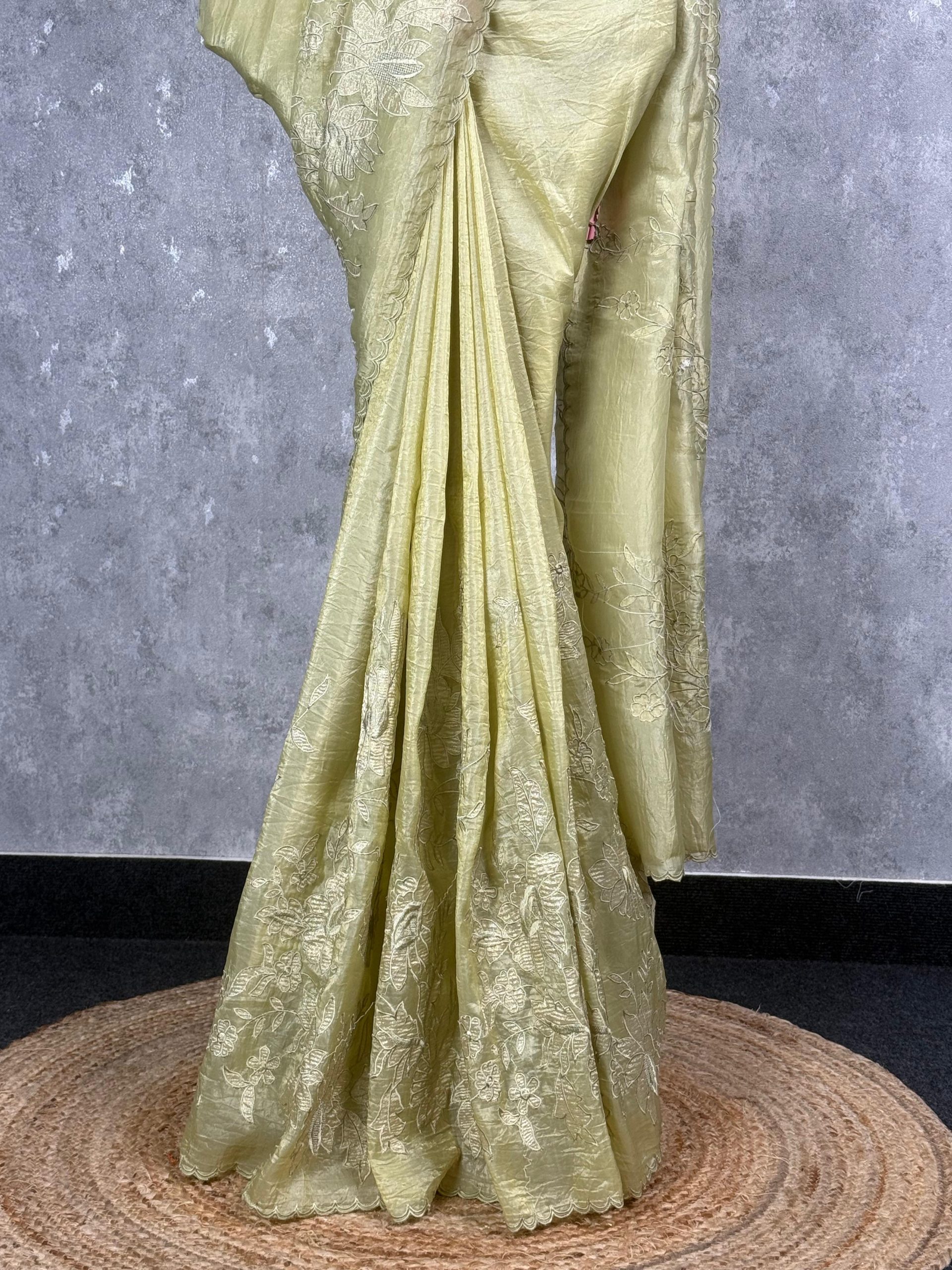 This saree features a refreshing pastel lime green shade that exudes charm and grace. The delicate floral embroidery adds a touch of sophistication, making it perfect for festive and elegant occasions. Its subtle sheen enhances the overall appeal for a refined look.