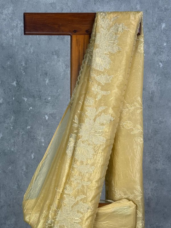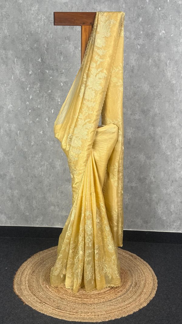 This saree comes in a soft mustard yellow shade that radiates warmth and elegance. The intricate floral embroidery enhances its traditional charm, making it a perfect pick for festive and daytime celebrations. Its subtle sheen adds a graceful and refined finish.