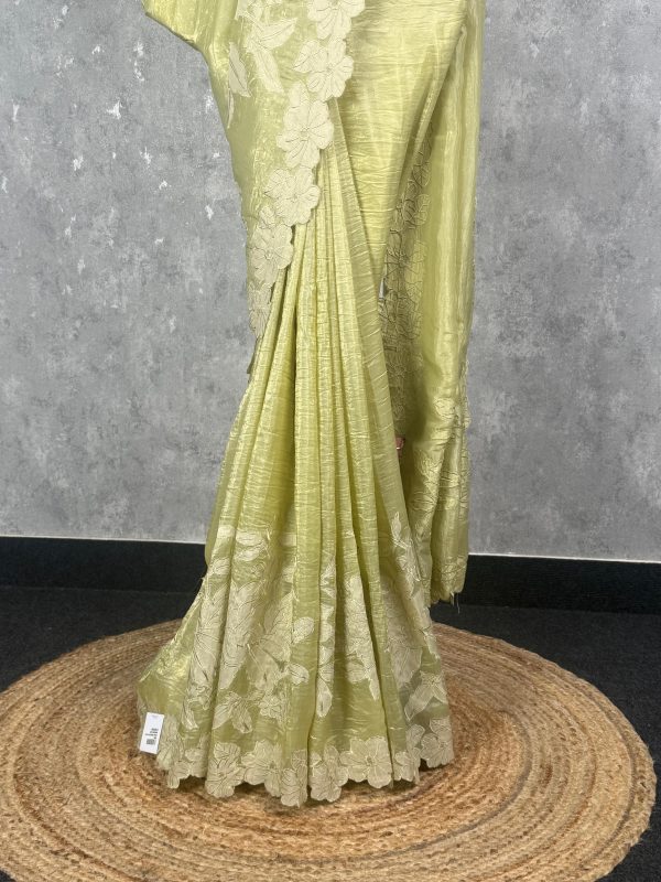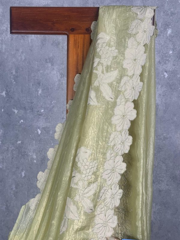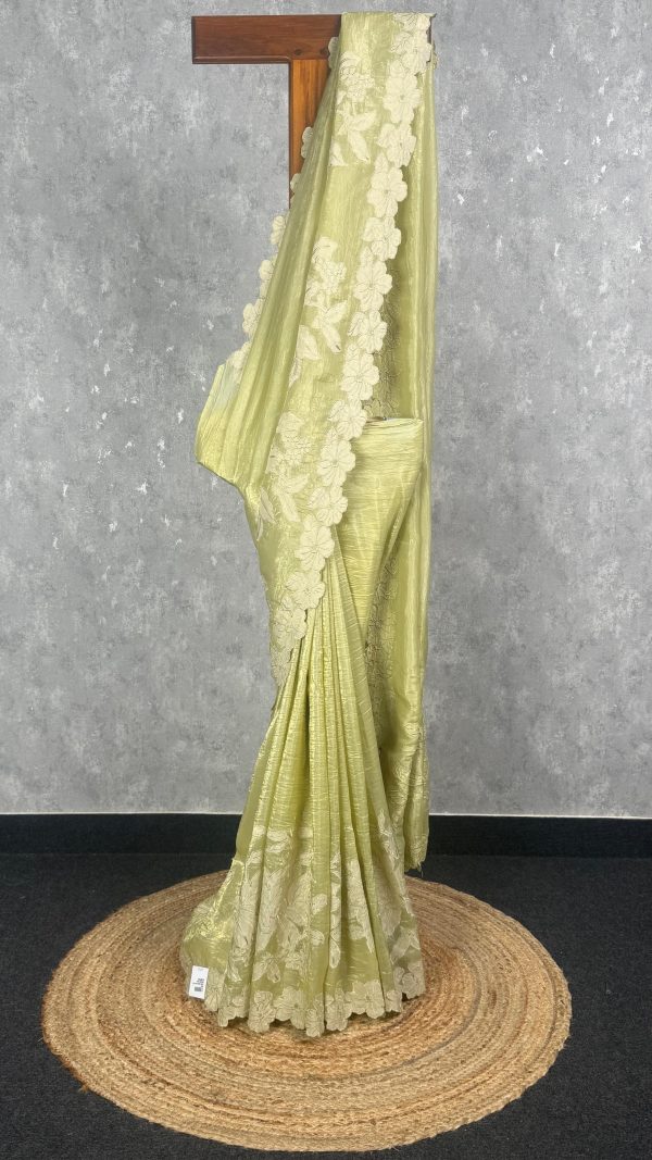 This image showcases a beautiful pastel green saree with intricate floral embroidery along the border. The fabric appears to have a subtle sheen and a delicate texture, giving it an elegant and graceful appeal. Perfect for festive occasions or formal gatherings, it exudes timeless sophistication and charm.
