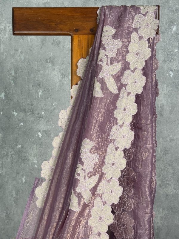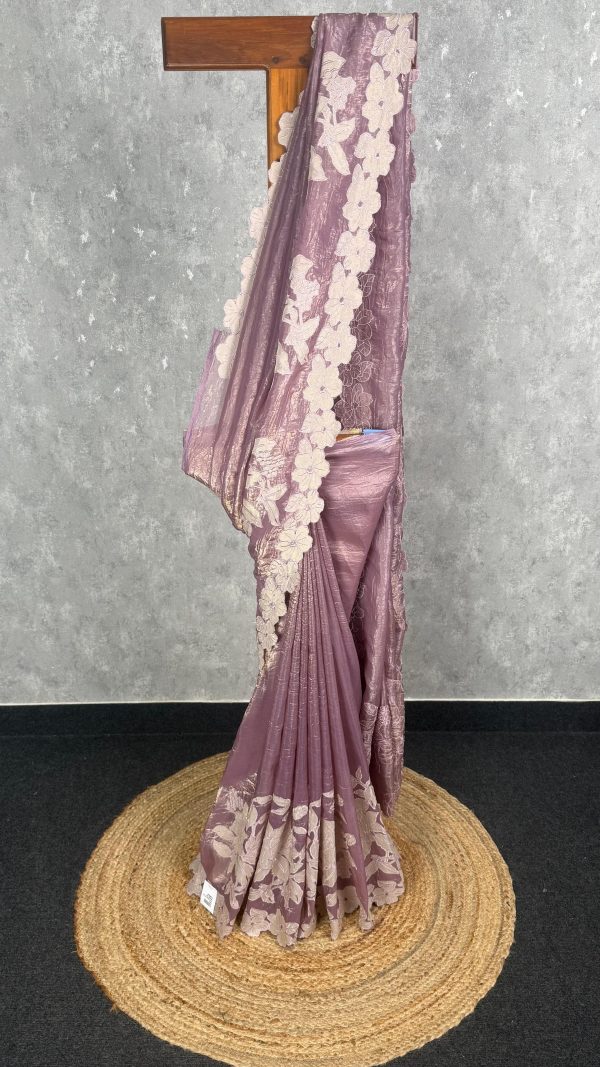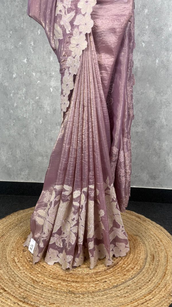 This image features a stunning mauve saree adorned with delicate floral embroidery along the border. The fabric has a subtle sheen, giving it a luxurious and graceful appearance. Its soft color and intricate detailing make it a perfect choice for festive occasions or elegant gatherings. The saree beautifully blends traditional charm with modern sophistication.