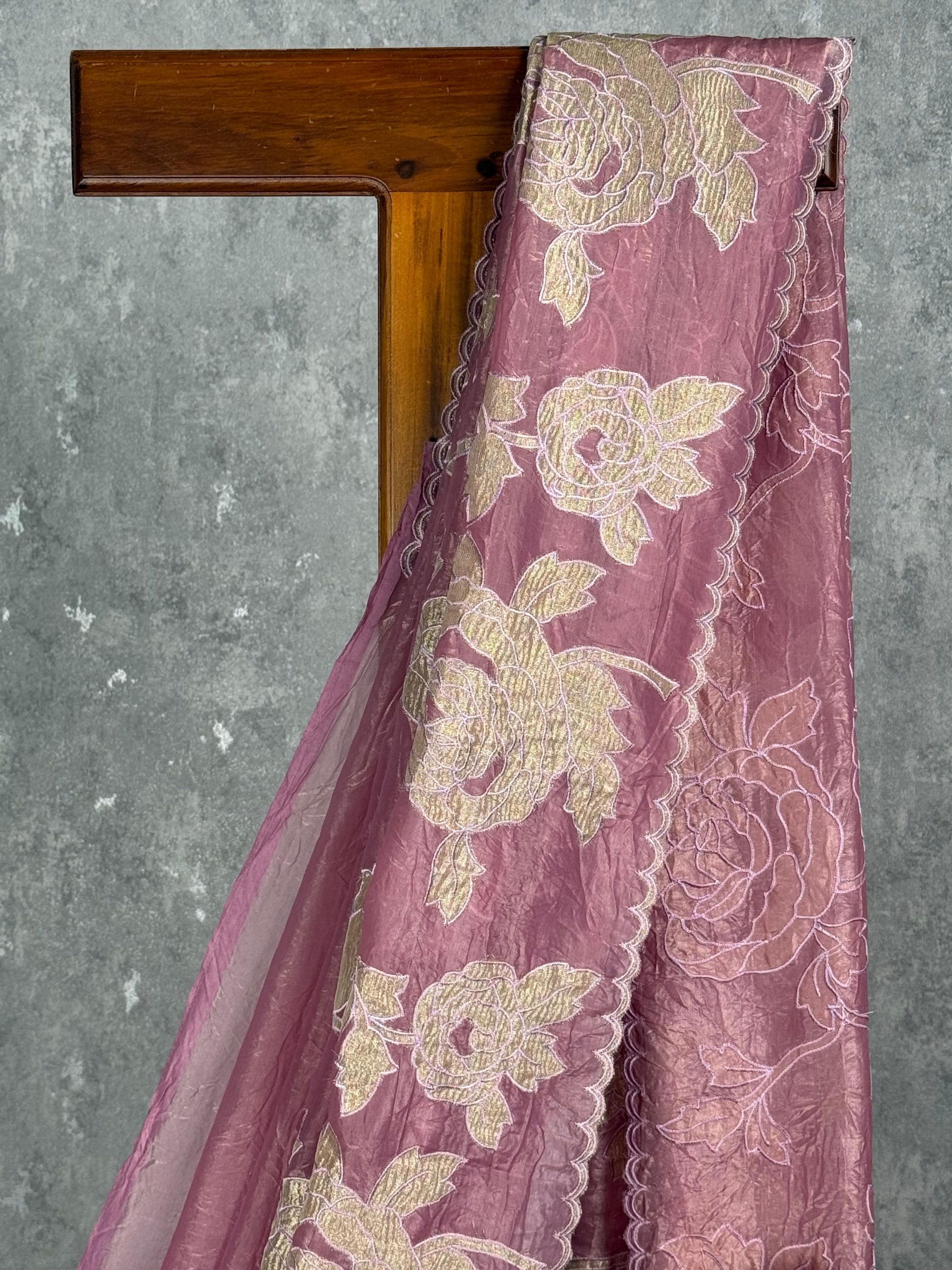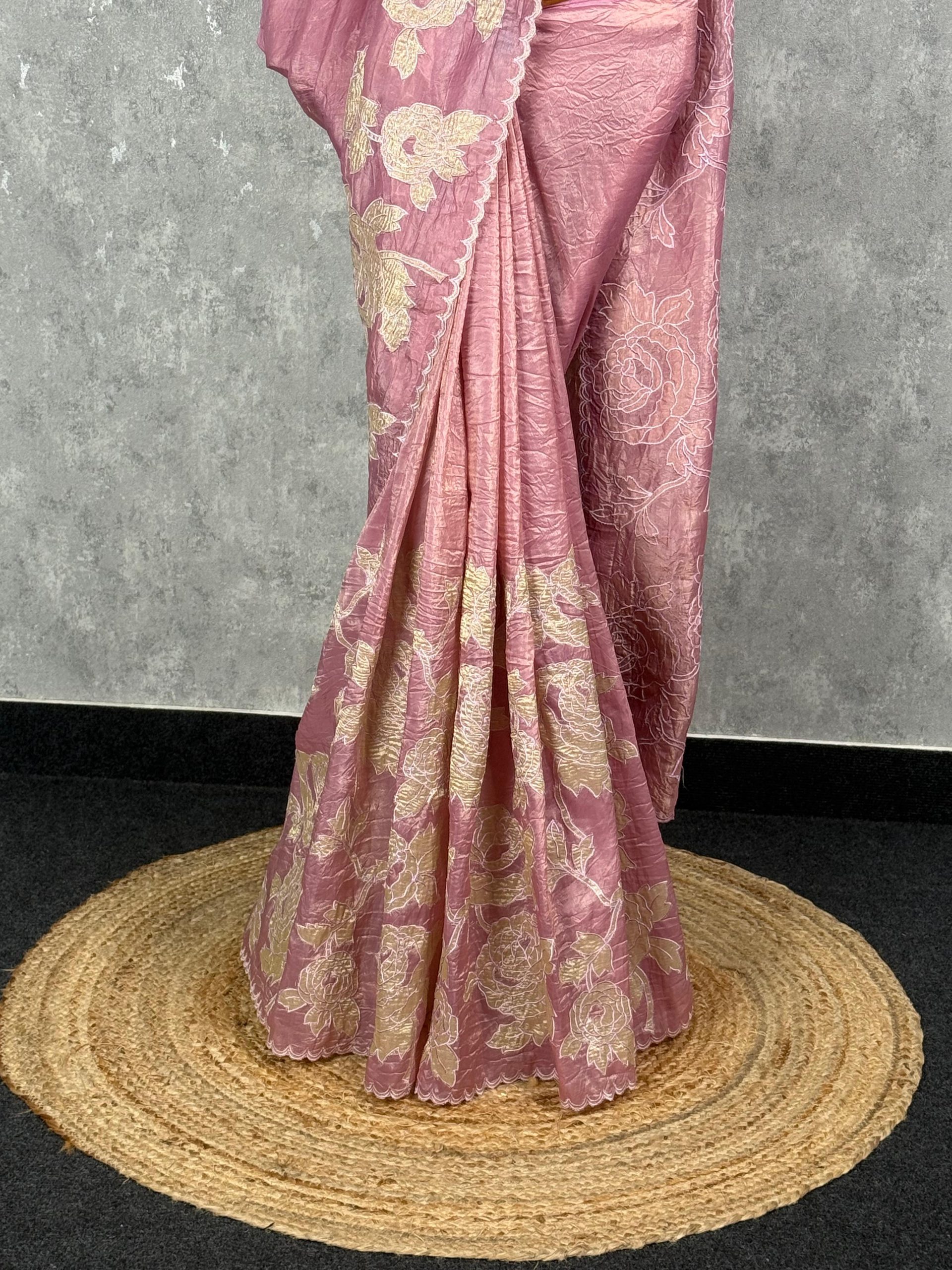 This image features a stunning dusty rose saree adorned with intricate golden floral embroidery. The fabric has a soft shimmer, enhancing its elegant and sophisticated look. Perfect for festive occasions or celebrations, it beautifully combines tradition with modern charm.